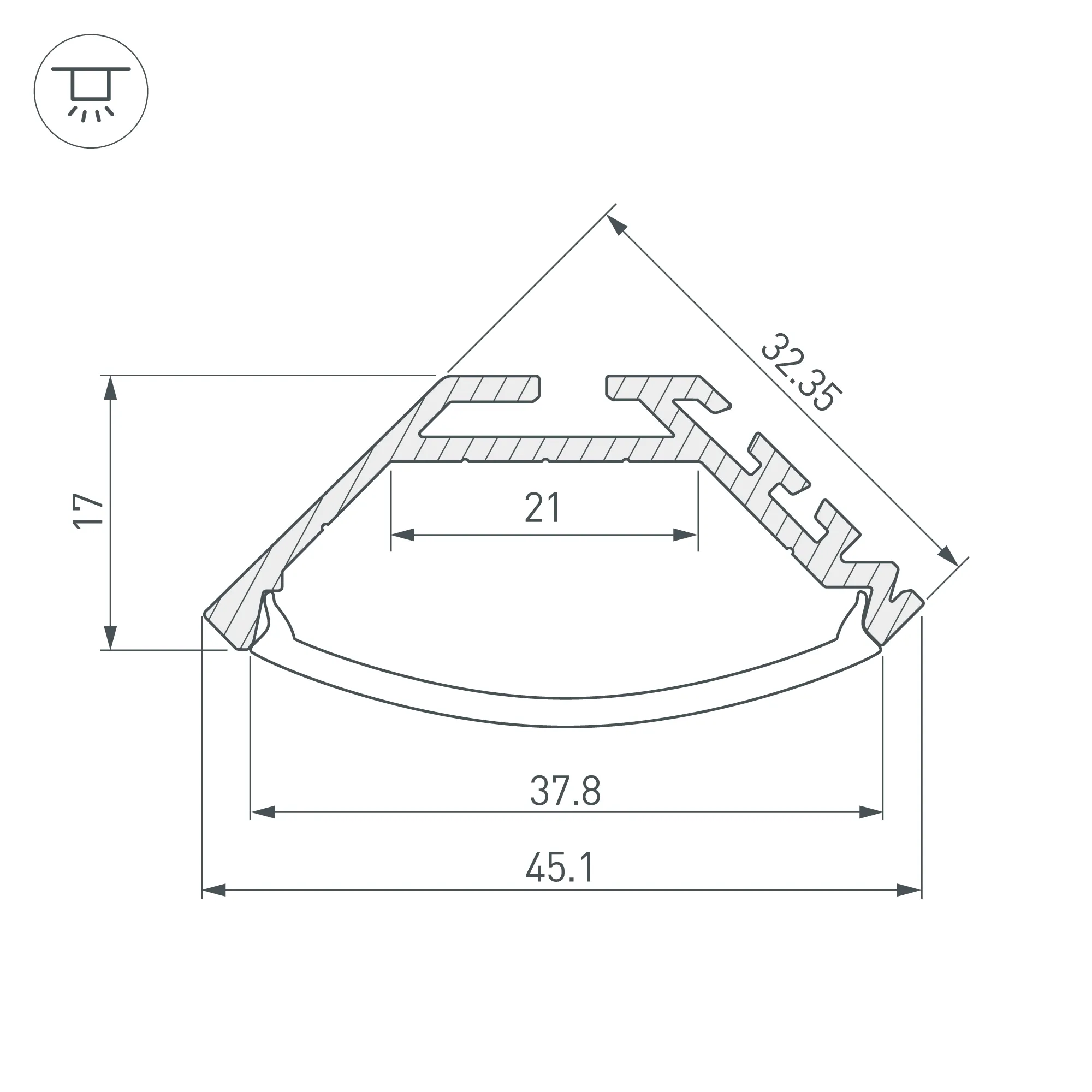 Алюминиевый анодированный угловой профиль для светодиодных лент и линеек. Габаритные размеры (L×W×H): 2000x45,1x17 мм. Ширина площадки для ленты 21 мм. Экраны (плоские, круглые или квадратные), заглушки и другие аксессуары приобретаются отдельно. Цена за 1 метр.