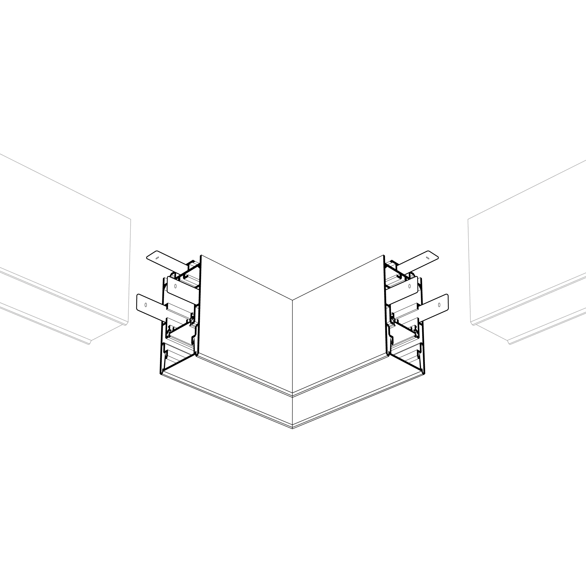 Прямой угол в сборе для соединения 2-х профилей S2-LINE-3360 под прямым углом 90°. Экран образует линию на плоскости. В комплекте матовый экран, площадка для ленты, соединители. Длина внешней стороны угла 100мм.
