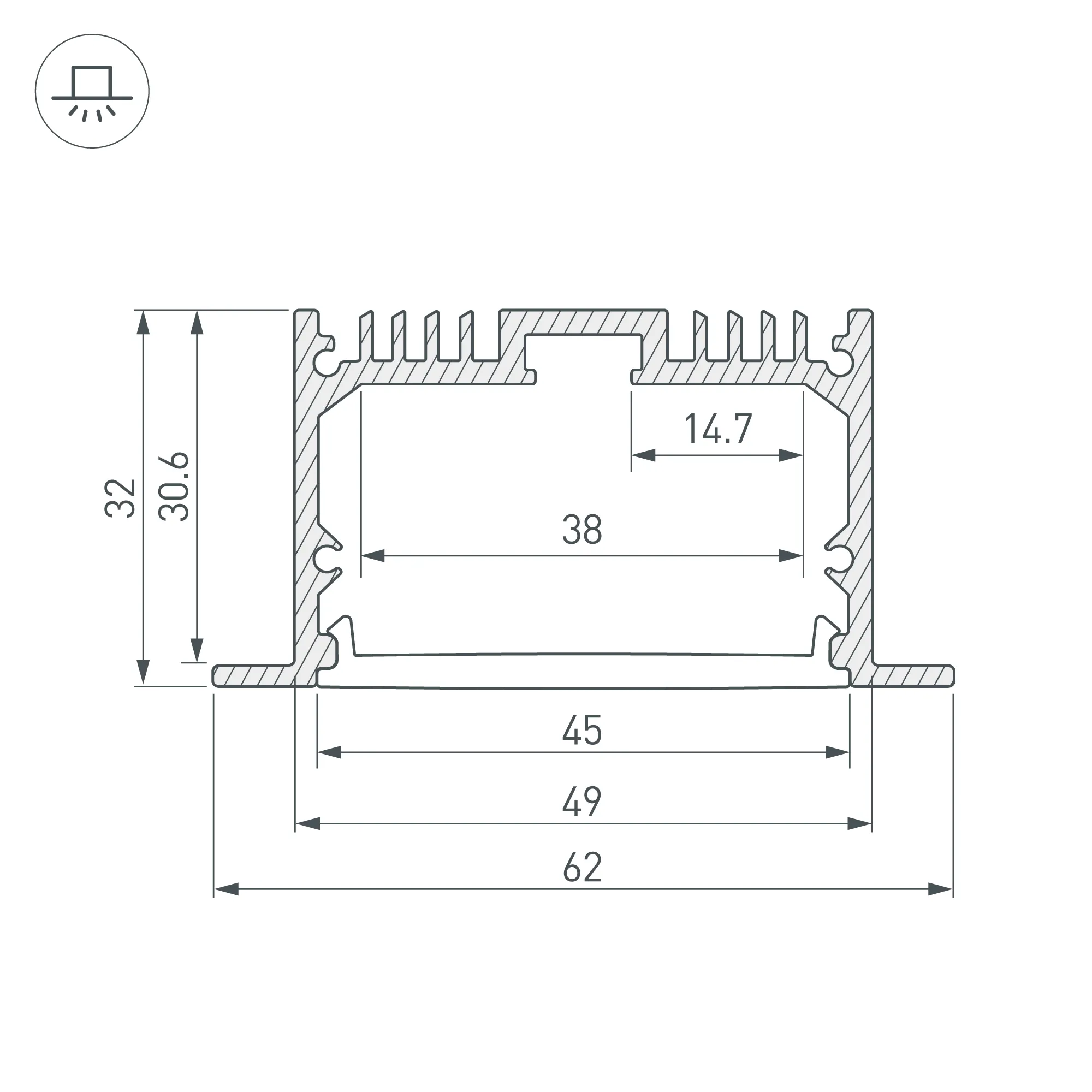 Комплект с экраном. Алюминиевый профиль для светодиодных лент и линеек. Цвет - белый RAL9003 (порошковая окраска). Габаритные размеры (L×W×H): 2500x62x32 мм, паз для установки 49 мм. Ширина площадки для ленты 38 мм. Аксессуары приобретаются отдельно.