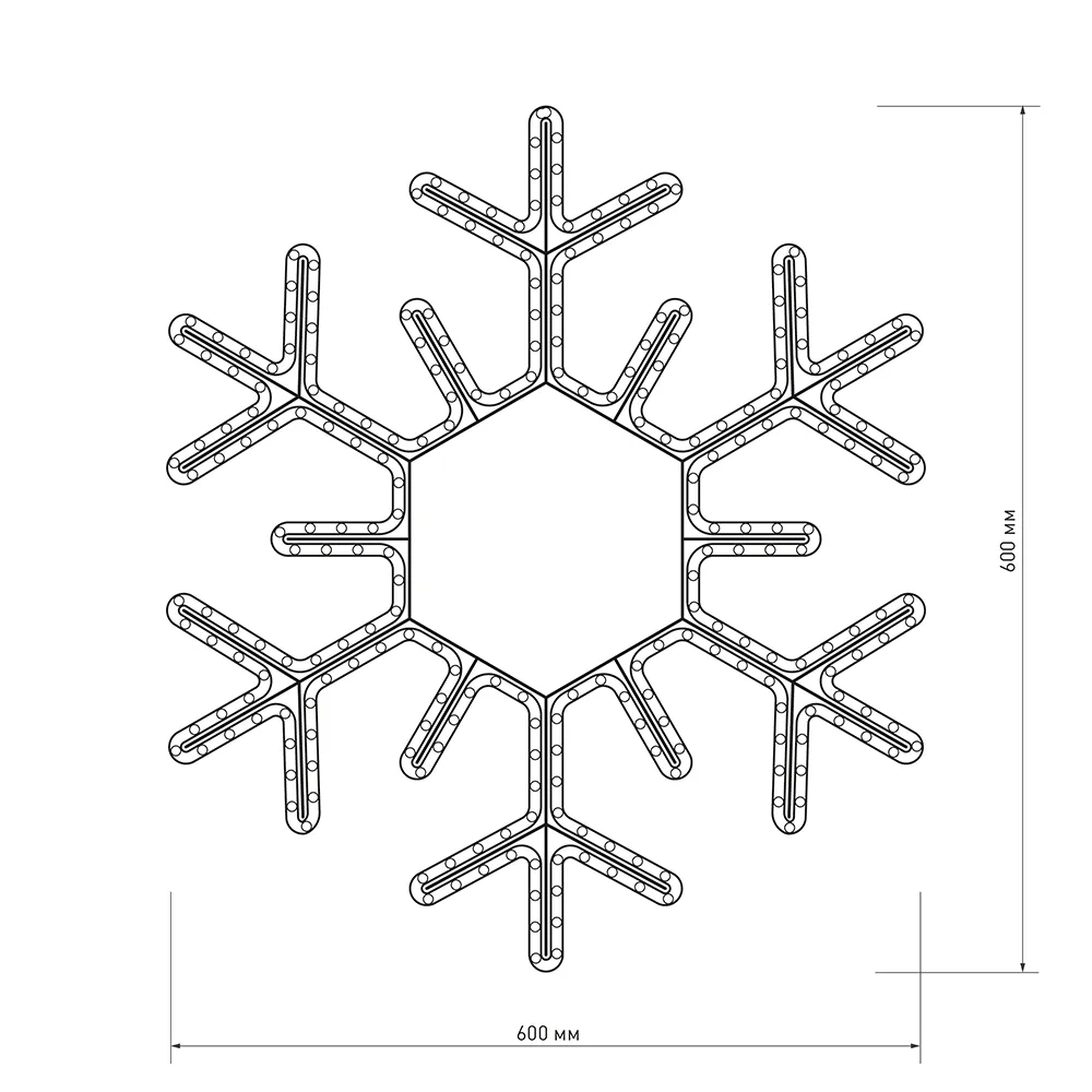 Светодиодная фигура СНЕЖИНКА. Размер 600x600 мм. Цвет светодиодов БЕЛЫЙ (6000 К), постоянное свечение. 216 светодиодов. Напряжение питания 230 В, потребляемая мощность 15 Вт, степень пылевлагозащиты IP65. Фигура укомплектована проводом питания для подключения к сети 230 В (без вилки питания).