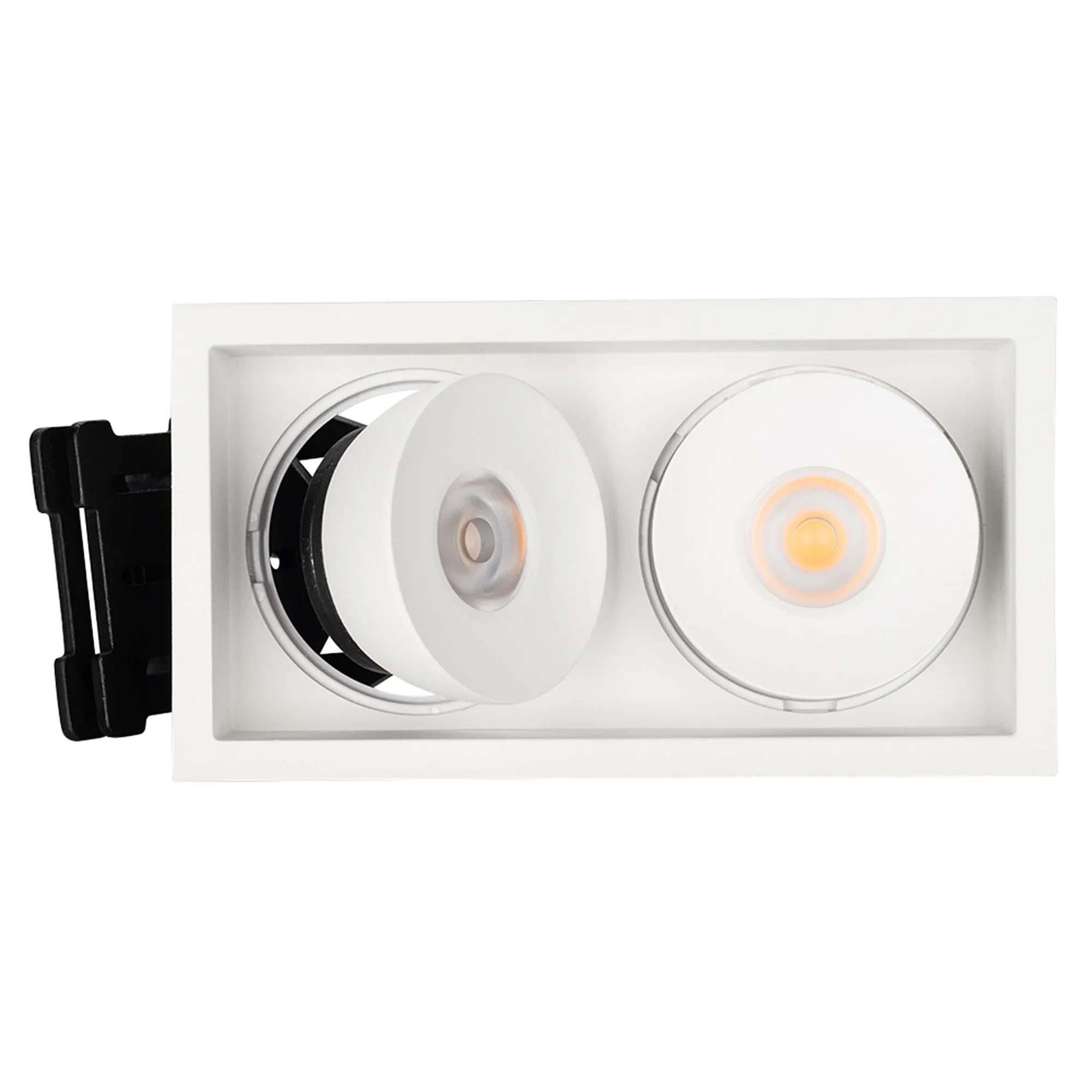 Встраиваемый поворотный светильник для потолка. Мощность 2x9W, цвет ТЕПЛЫЙ 3000K, св.поток 1260лм, угол 45°, RA>90. Корпус прямоугольный белый. Питание AC180-240V. Размеры LxWxH 148x80x90мм. Установка в отверстие 140x70мм. Драйвер в комплекте 2 шт (30-45V, 220mA).