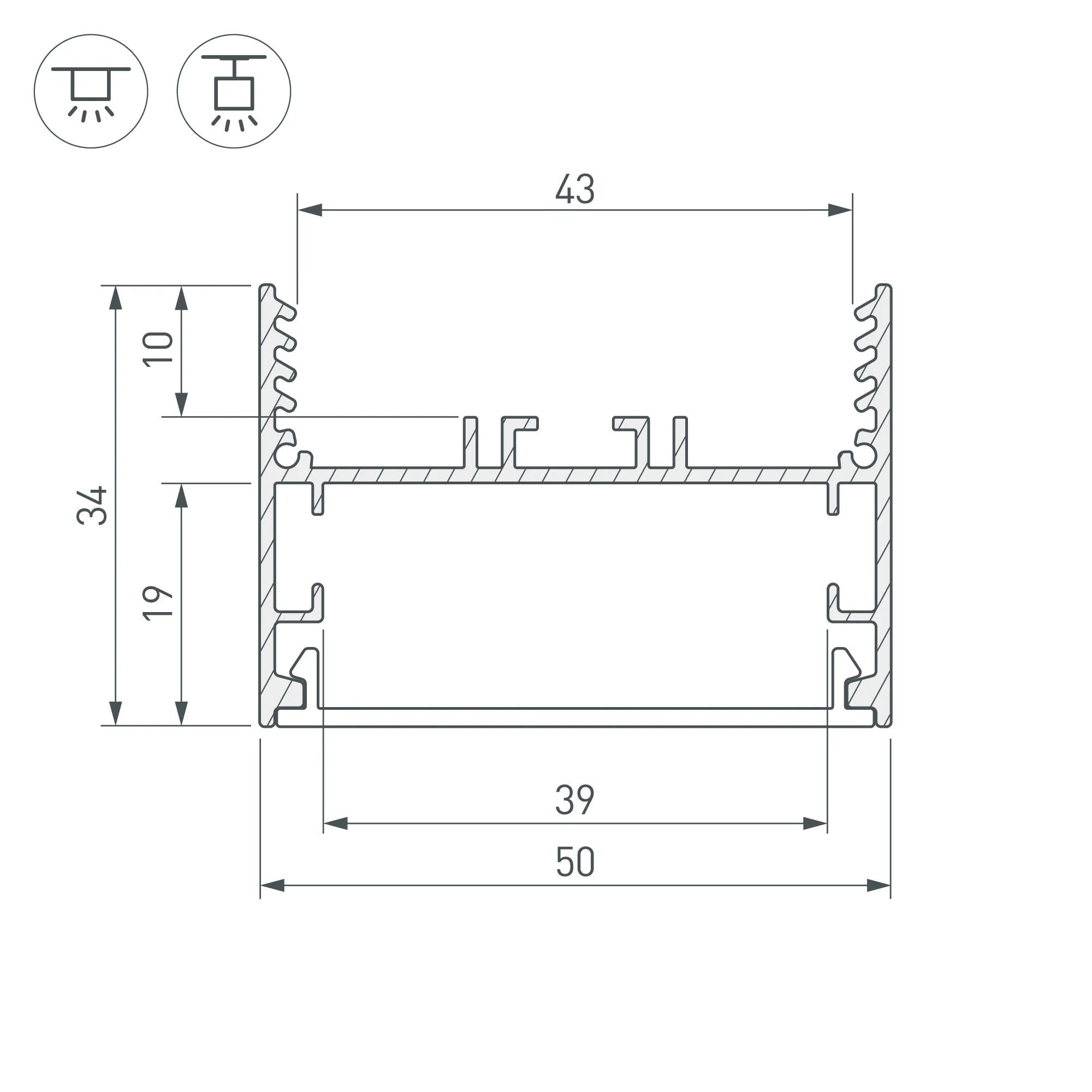 Алюминиевый анодированный профиль для светодиодных лент и линеек. Габаритные размеры (L×W×H): 2000x50x34 мм. Ширина площадки для ленты 38 мм. Экраны, заглушки и другие аксессуары приобретаются отдельно. Цена за 1 метр. При подвесном монтаже может быть оснащён блоком питания.