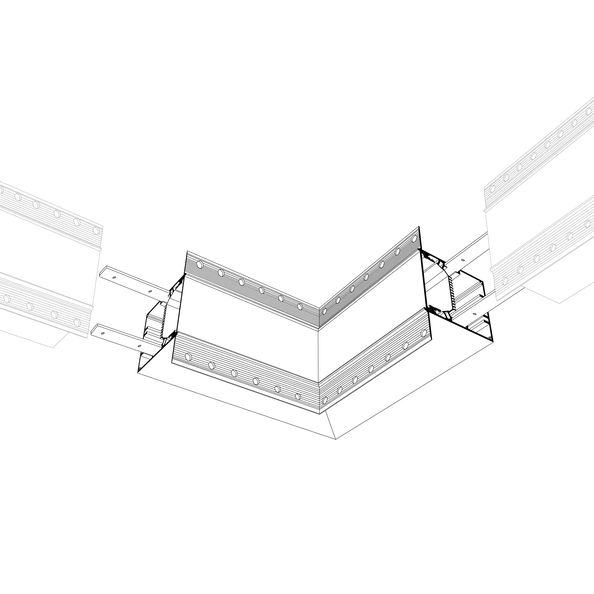Угол в сборе, для профиля SL-LINIA55-FANTOM. Свечение внутрь. В комплекте угол с экраном, соединители, винты, шестигранный ключ.