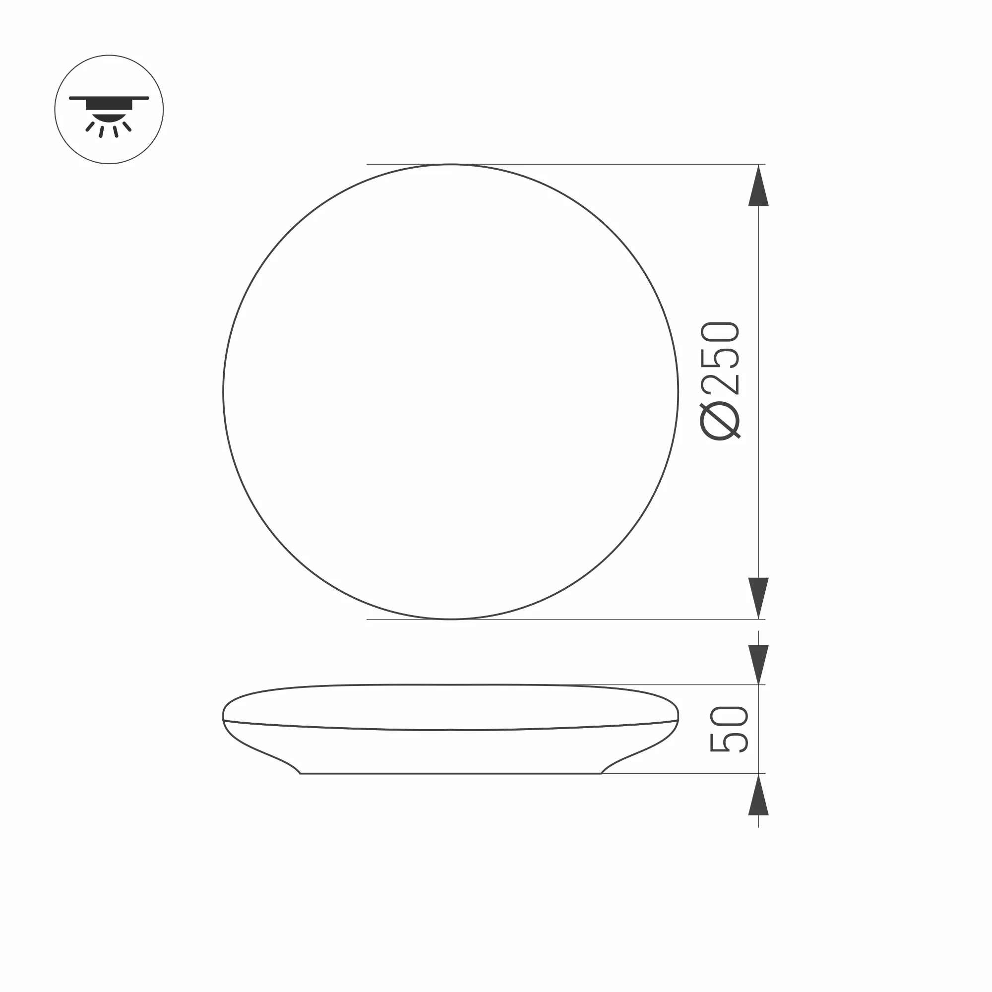 Накладной светильник 12Вт с микроволновым датчиком движения, белый круглый корпус (IK10). Цвет БЕЛЫЙ ТЕПЛЫЙ 3000К, св.поток 1150-1200лм, CRI(Ra)>80, угол 180°. Размер Ф250x50мм. Материал рассеивателя PMMA. Материал корпуса ABS пластик. Питание AC220-240V, 12Вт, драйвер встроенный (72V, 160mA). Диммирование по TRIAC.