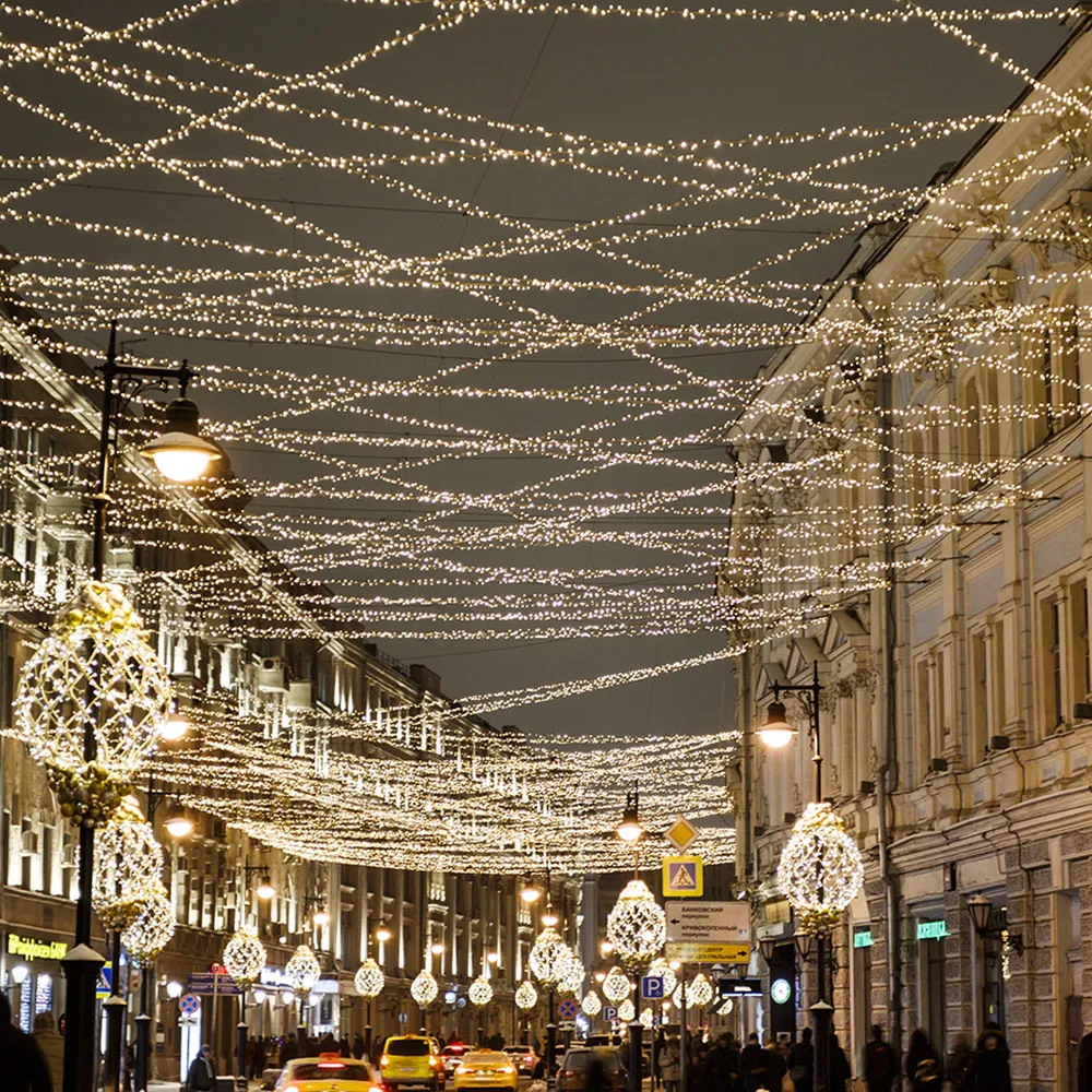 Светодиодная нить Classic. Размер 10000 мм. 100 светодиодов размером 7 мм. Основной цвет свечения ТЕПЛЫЙ БЕЛЫЙ (3000 К), эффект мерцания редких точек (БЕЛЫЙ 6000К) с мягким световым рисунком (выпуклая молочно-белая линза), соотношение светодиодов: 84 теплых постоянного свечения / 16 белых с мерцанием. Эффект частого мерцания. Провод белый, ПВХ. Питание 230 В, Мощность 7 Вт, защита IP65, применение в помещении и на улице под навесом. Аксессуар для подключения приобретается отдельно.