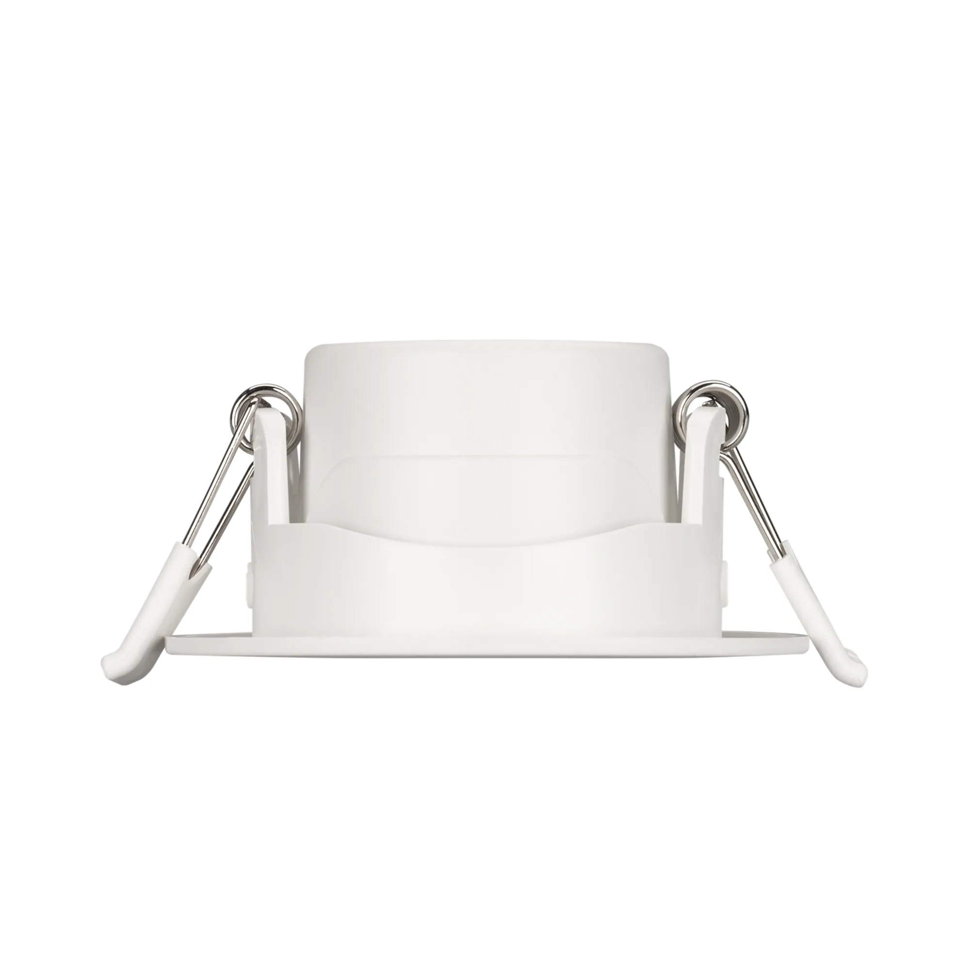 Встраиваемый поворотный светильник "даунлайт". Мощность 4.5 Вт, св. поток 400 лм, 89 лм/Вт, теплый 3000 K, CRI>80, UGR<19, угол 36°, напряжение питания 230 В. Белый круглый корпус из теплопроводящего полиамида, экран пластик, степень защиты IP20, угол поворота оси 30°. Размер: диаметр 80 мм, высота 37.5 мм. Монтаж встраиваемый, установочное отверстие диаметр 60-70 мм. Пульсация <2%.