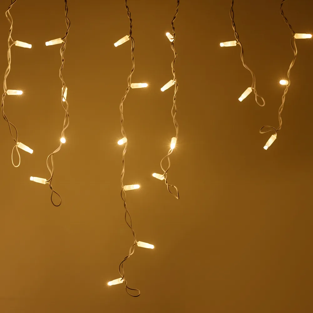 Светодиодная бахрома Pro. Размер 5600x900 мм (длина 5600 мм, по длине 48 нитей высотой 200/900 мм). Количество светодиодов 240 шт размером 7 мм. Цвет свечения ТЕПЛЫЙ БЕЛЫЙ (3000 К), эффект постоянного свечения с мягким световым рисунком (выпуклая молочно-белая линза). Провод белый, резиновый. Питание 230 В, Мощность 15 Вт, защита IP65, применение на улице под навесом. Аксессуары для подключения приобретаются отдельно.