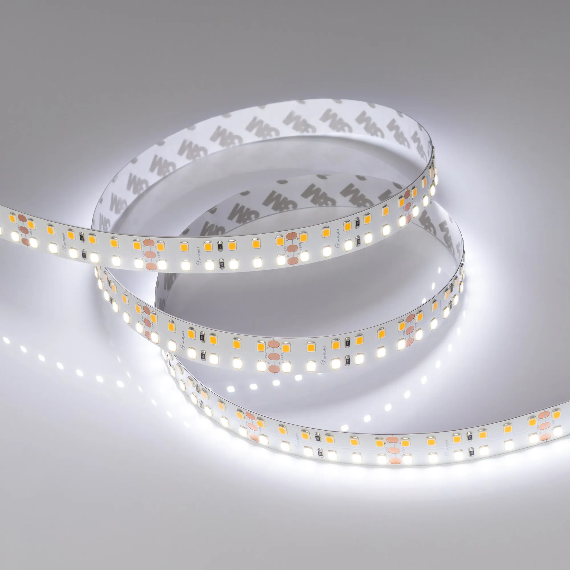 Светодиодная лента RT серии A240 с изменяемым цветом свечения. Светодиоды SMD 2835, 240 шт/м, белая плата шириной 15 мм, скотч 3M. Цвет MIX БЕЛЫЙ 6000K + ТЕПЛЫЙ 2700K, индекс цветопередачи CRI>85, угол 120°. Питание 24 В, мощность 19.2 Вт/м (96 Вт на 5 м). Размеры 5000x15x1.8 мм. Мин. отрезок 50 мм, 12 светодиодов. Цена за 1 м.