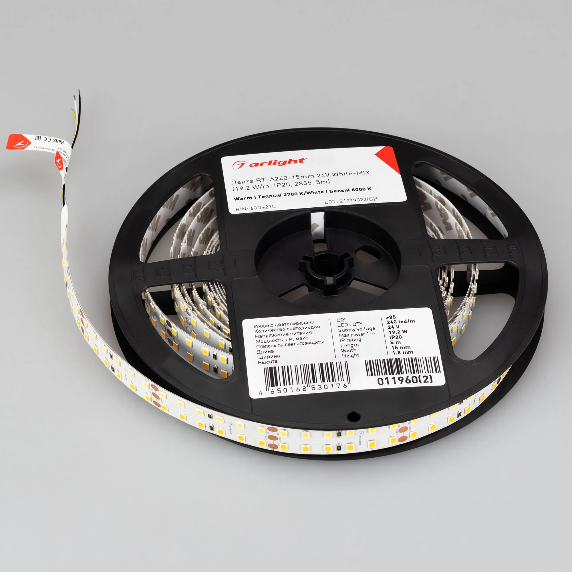 Лента светодиодная RT-A240-15mm 24V White-MIX (19.2 W/m, IP20, 2835, 5m) (Arlight, Изменяемая ЦТ)