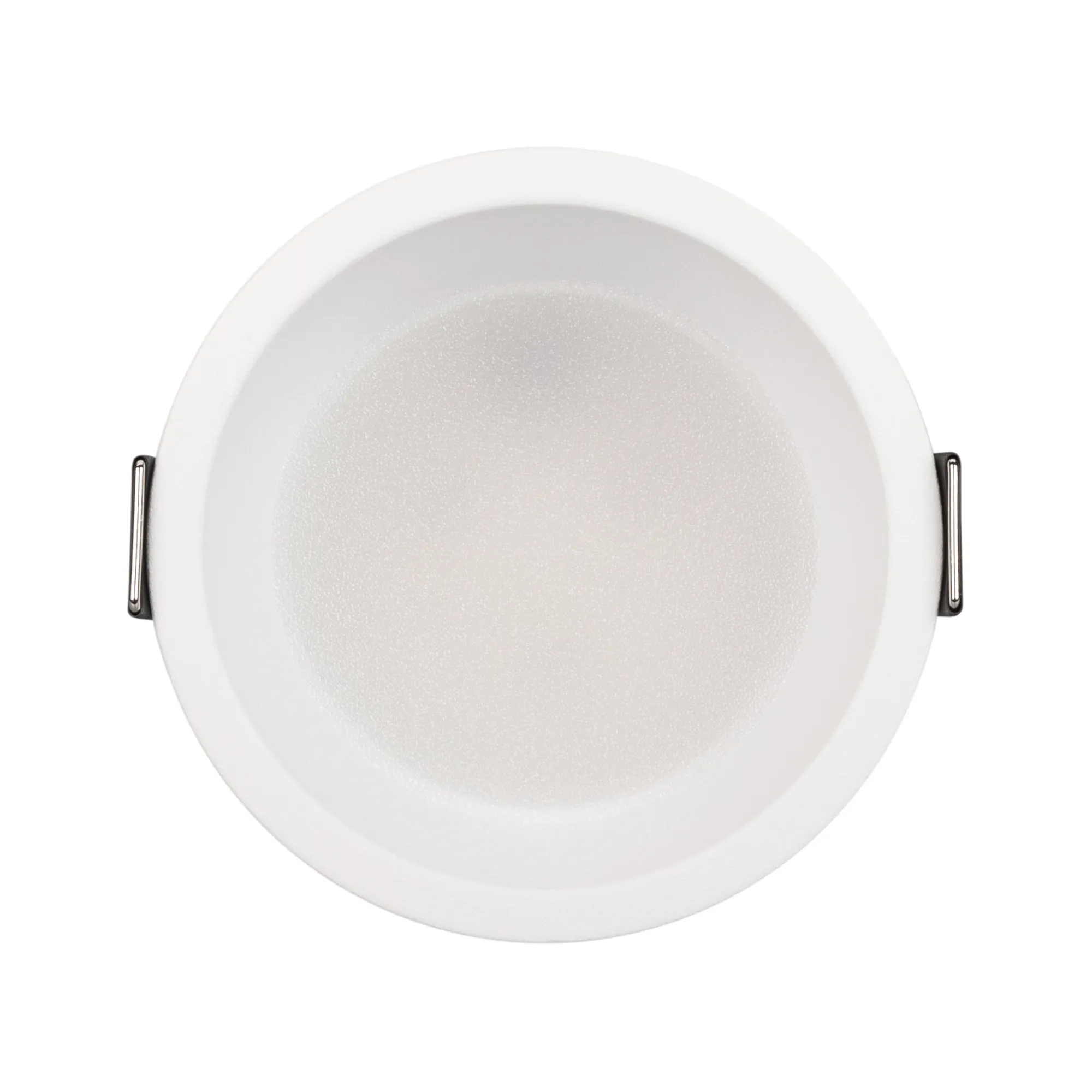 Встраиваемый светильник даунлайт. Мощность 9 Вт, св. поток 595 лм, 66 лм/Вт, дневной 4000 K, CRI>90, угол 85°, напряжение питания 230 В. Белый круглый корпус из алюминия, степень защиты IP20. Размер: диаметр 82 мм, высота 46 мм. Монтаж встраиваемый, установочное отверстие: диаметр 75 мм. Драйвер 27-42 В, 200 мА, пульсация <2%.