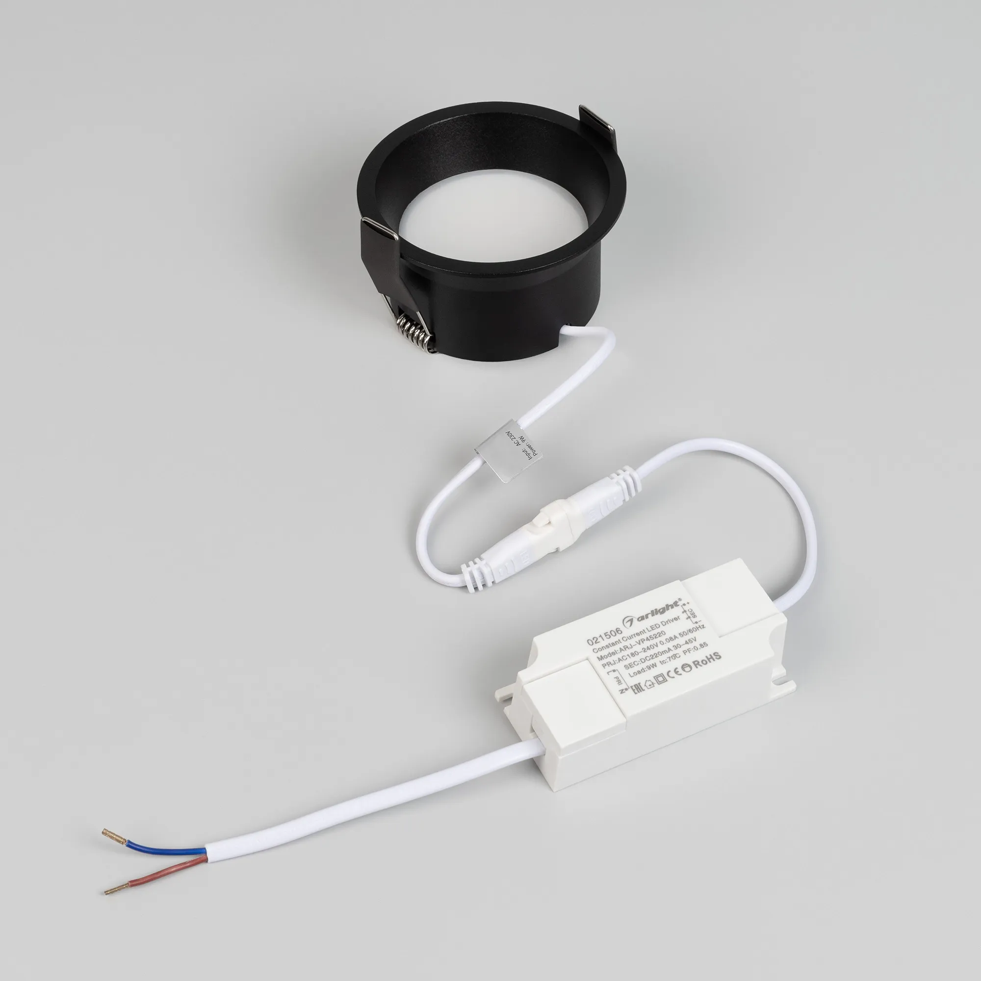 Встраиваемый светильник даунлайт. Мощность 9 Вт, св. поток 500 лм, 56 лм/Вт, дневной 4000 K, CRI>90, угол 80°, напряжение питания 230 В. Чёрный круглый корпус из алюминия, степень защиты IP20. Размер: диаметр 82 мм, высота 46 мм. Монтаж встраиваемый, установочное отверстие: диаметр 75 мм. Драйвер 27-42 В, 200 мА, пульсация <2%.