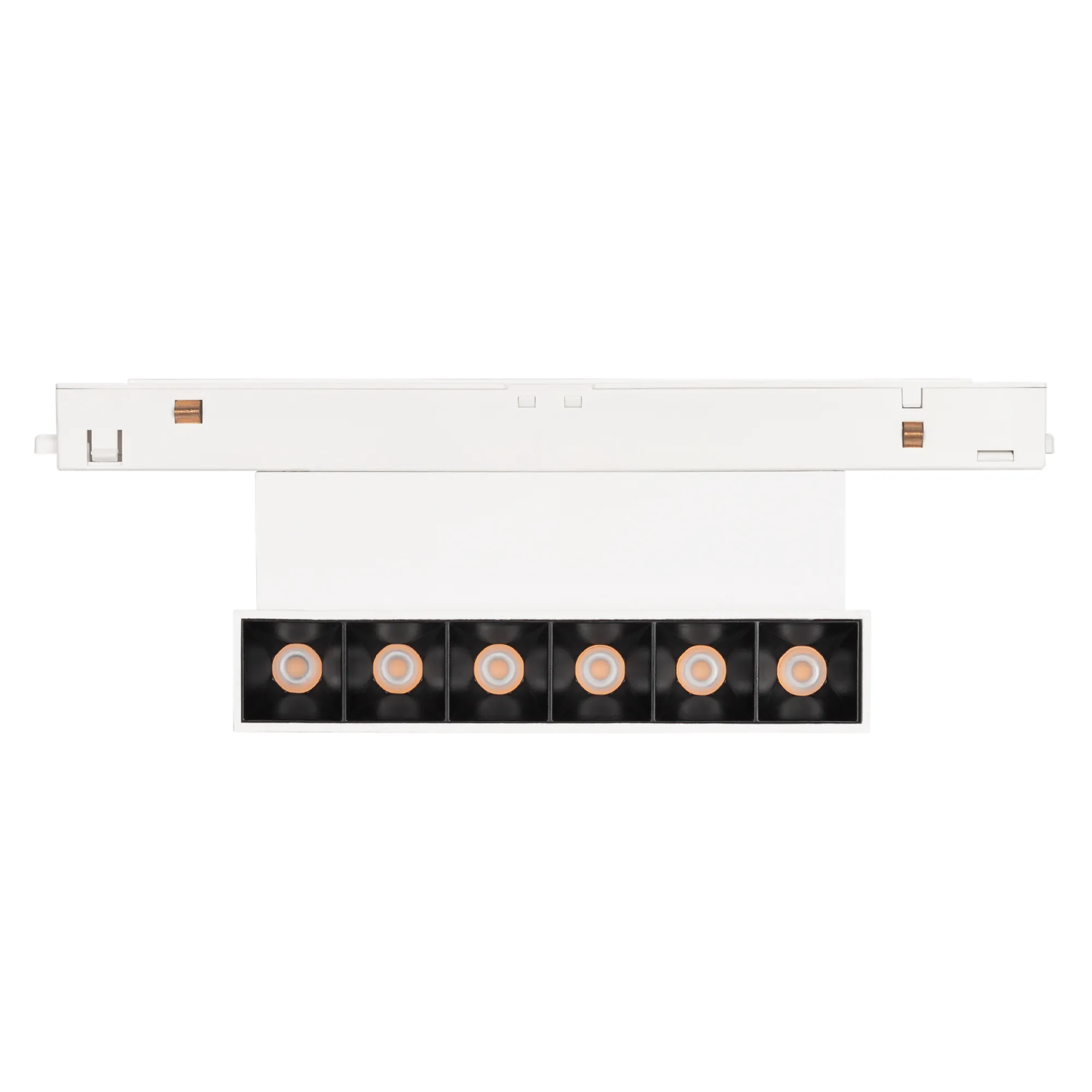 Светильник для магнитных треков MAG-ORIENT шириной 26 мм с управлением DALI. Мощность 6 Вт, св. поток 250 лм, 42 лм/Вт, теплый 3000 K, CRI>90, угол 30°, напряжение питания 48 В. Белый прямоугольный корпус из металл, экран поликарбонат, степень защиты IP20. Размер: длина 204 мм, ширина 23 мм, высота 104 мм. Монтаж на трек MAG-ORIENT. Пульсация <1%.