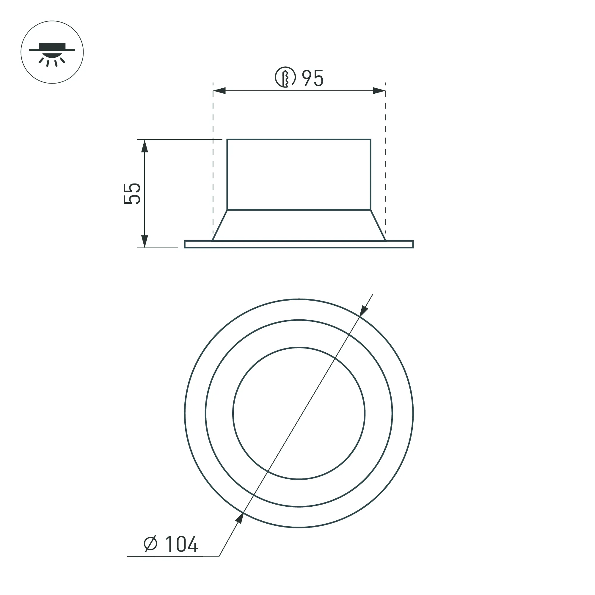 Встраиваемый светильник даунлайт. Мощность 12 Вт, св. поток 670 лм, 56 лм/Вт, тёплый 3000 K, CRI>90, угол 85°, напряжение питания 230 В. Чёрный круглый корпус из алюминия, степень защиты IP20. Размер: диаметр 104 мм, высота 55 мм. Монтаж встраиваемый, установочное отверстие: диаметр 95 мм. Драйвер 27-42 В, 300 мА, пульсация <2%.