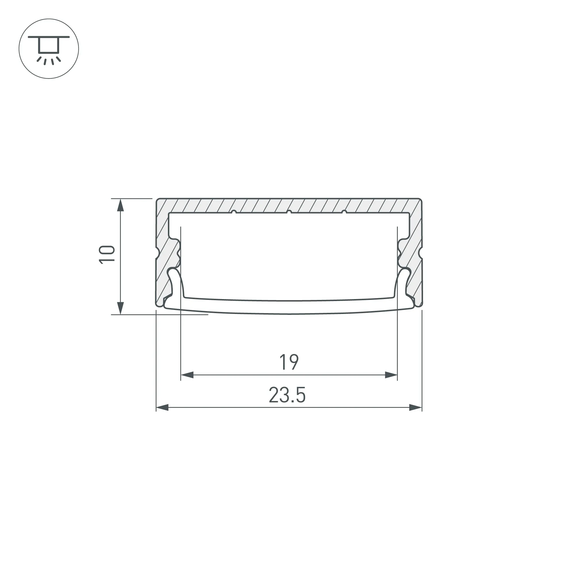 Алюминиевый анодированный накладной профиль для светодиодных лент и линеек. Габаритные размеры (L×W×H): 2000x23,5x10 мм. Ширина площадки для ленты 19 мм.
