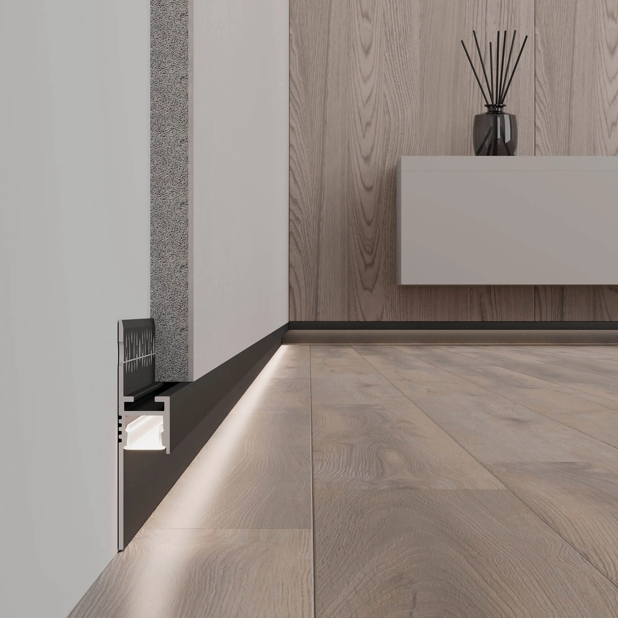 Алюминиевый профиль для светодиодных лент и линеек, для подсветки стен и пола по периметру. Цвет - черный RAL9005 (порошковая окраска). Габаритные размеры (L×W×H): 2000x13,2x60 мм. Ширина площадки для ленты 9,2 мм. Аксессуары приобретаются отдельно. Цена за метр.