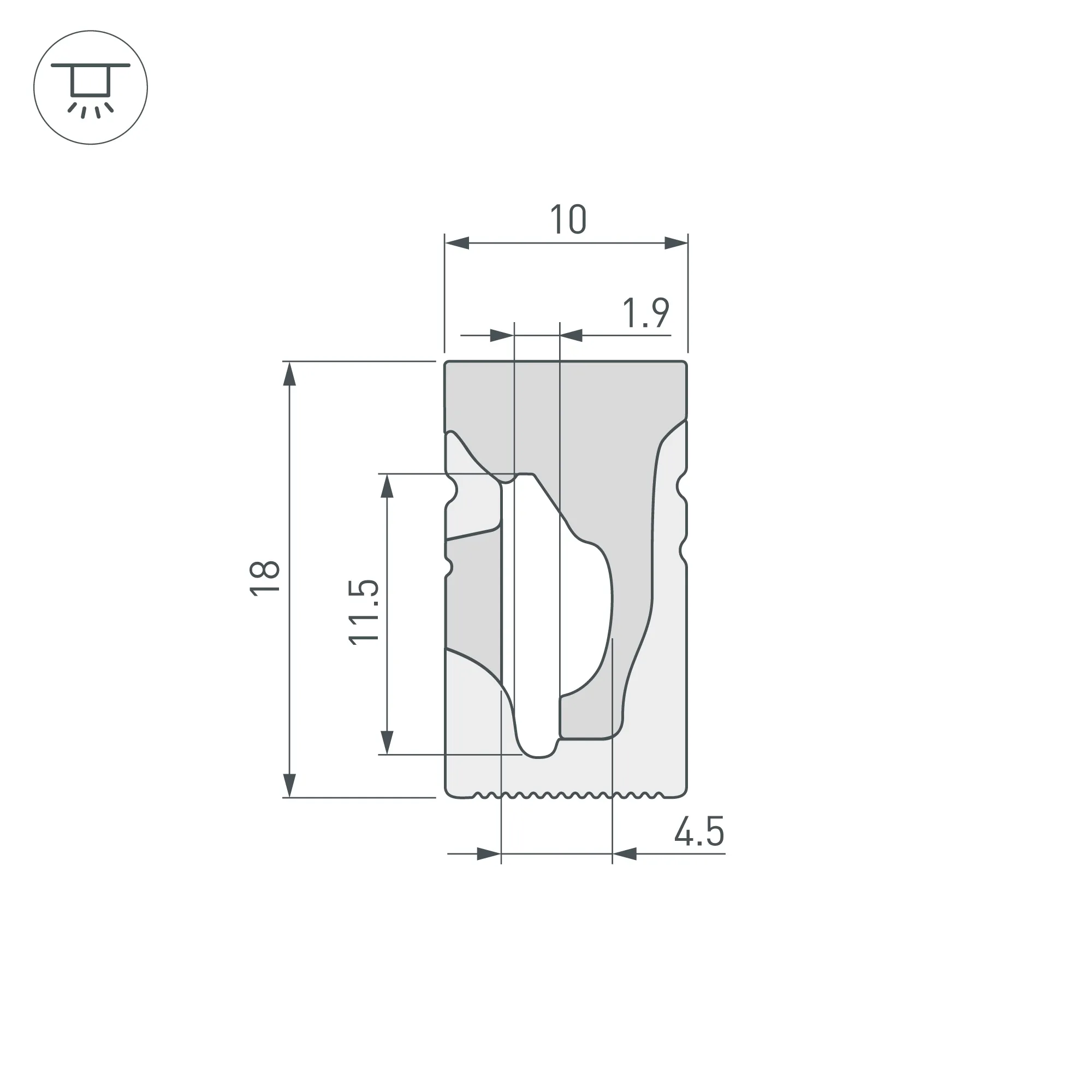 Цельнолитой силиконовый гибкий профиль, белый матовый. Габаритные размеры 20000×10×18 мм. Горизонтальный изгиб SIDE, минимальный радиус изгиба 30 мм. Для установки во влажных помещениях необходима герметизация при помощи двухкомпонентного эпоксидного герметика. Класс пылевлагозащиты – IP65 (при соблюдении технологии герметизации). Для лент шириной от 8 до 10 мм, высотой до 3,5 мм и мощностью до 10 Вт/м. При подборе ленты необходимо учитывать, что втяжка лент COB, герметичных лент и лент с наличием силиконового слоя может быть затруднена. Угол излучения 125°. Поставляется в катушках по 20 м. Цена за 1 м.