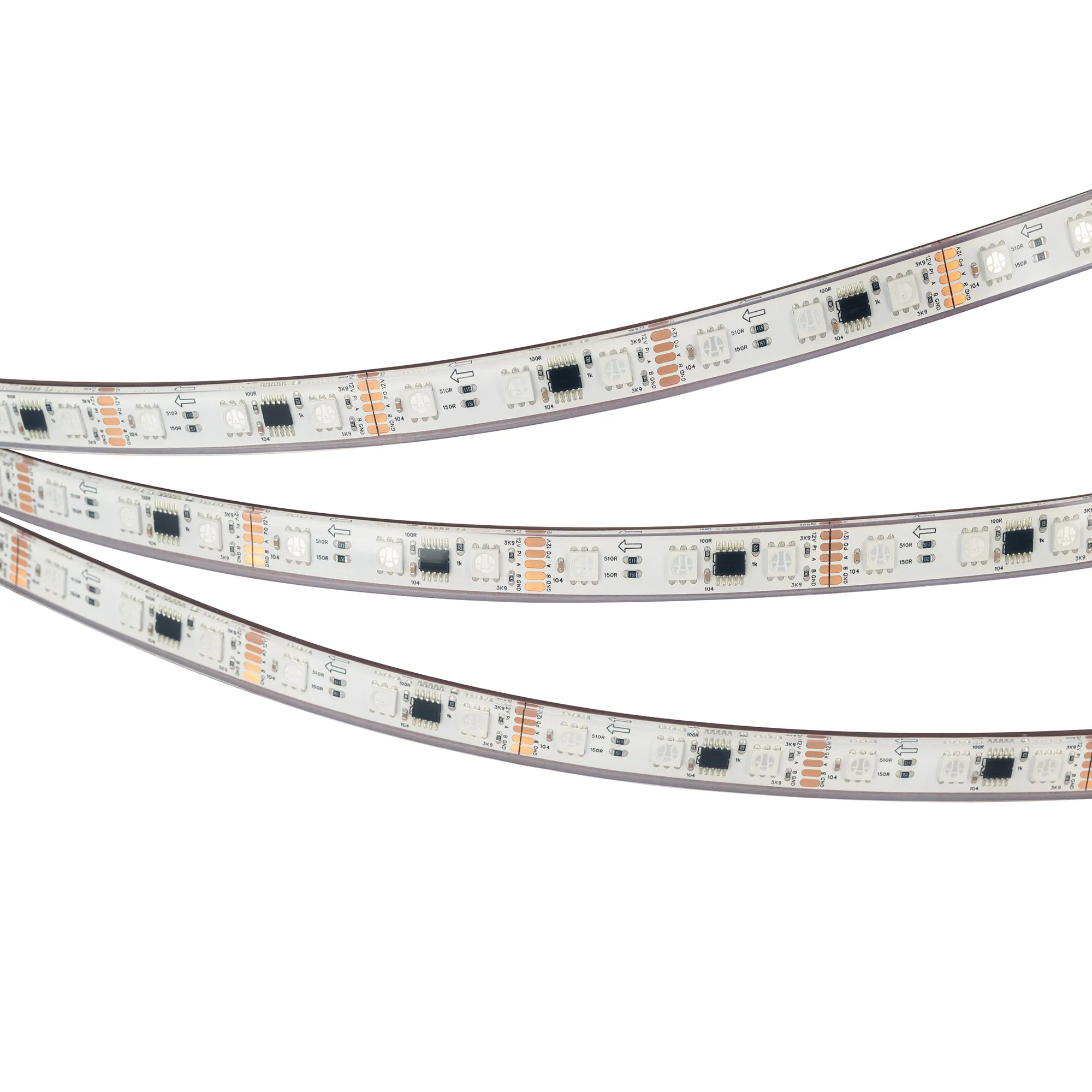 Светодиодная герметичная лента DMX серии B60 с микросхемой GS8516 (GS8526), IP67 (PS - силиконовая экструзия). Светодиоды SMD 5060, 60 шт/м, 20 pixels на 1 м (100 pixels на 5 м), 1 pixel = 3 светодиода, белая плата шириной 10 мм, скотч 3М. Цвет RGB, угол 120°. Питание 12 В, мощность 14 Вт/м (70 Вт на 5 м). Размеры 5000x12x5 мм. Мин. отрезок 50 мм, 3 светодиода. Цена за 1 м.