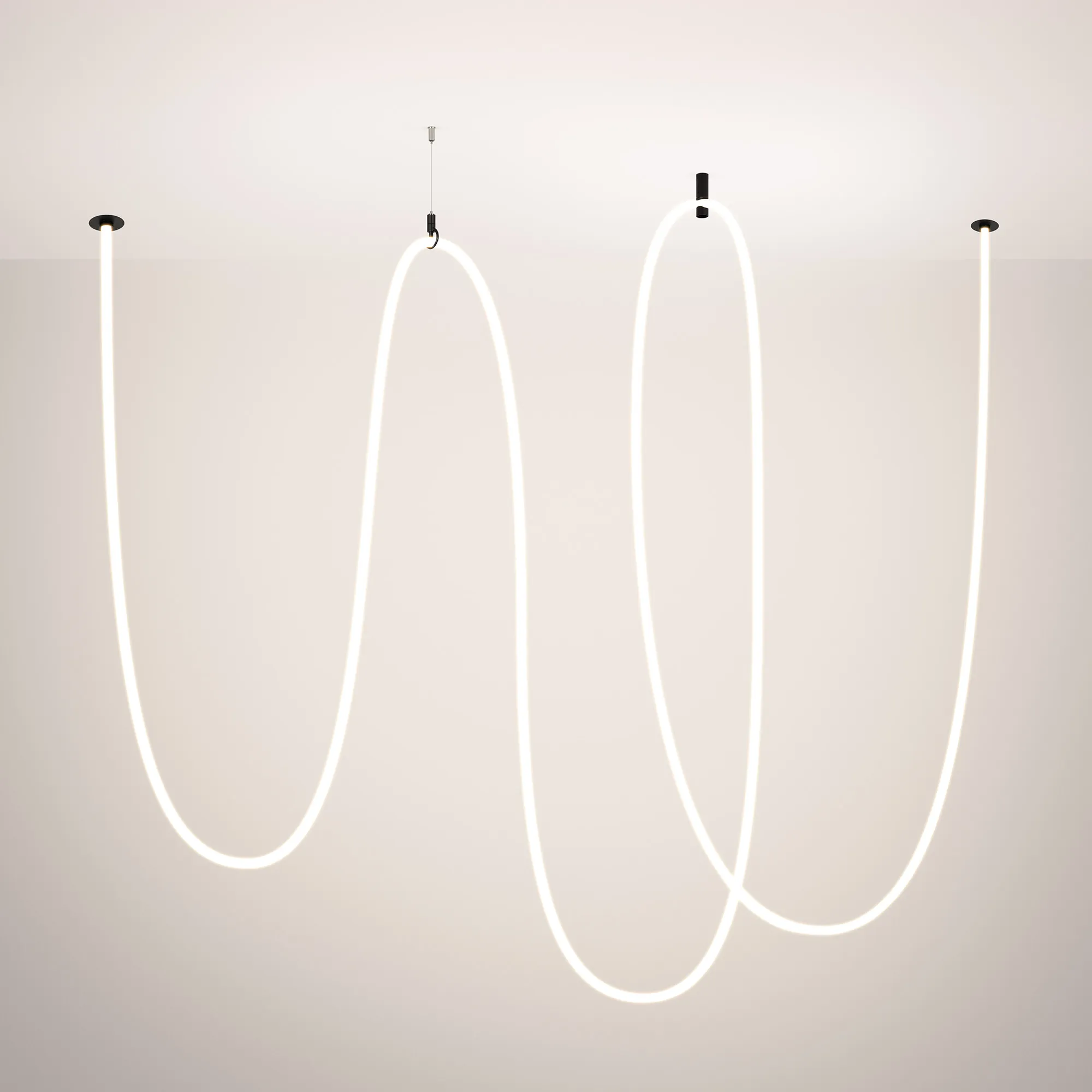 Подвесной светильник. Мощность 110 Вт, св. поток 5960 лм, 54 лм/Вт, тёплый 3000 K, CRI>90, угол 360°, напряжение питания 230 В. Черный круглый корпус из стали, силиконовая герметичная лента, степень защиты IP20. Размер: диаметр утапливаемой части чаши 64 мм, высота чаши с утапливаемой частью без вывода под неон 40 мм, общая высота чаши 57 мм, диаметр чаши с фланцем 100 мм, диаметр силиконовой герметичной ленты 18 мм, длина силиконовой герметичной ленты 10000 мм. Монтаж встраиваемый, глубина установки 55 мм, диаметр установочного отверстия 70 мм. Блок питания 24 В, 2500 мА, пульсация <5% (2 шт.).