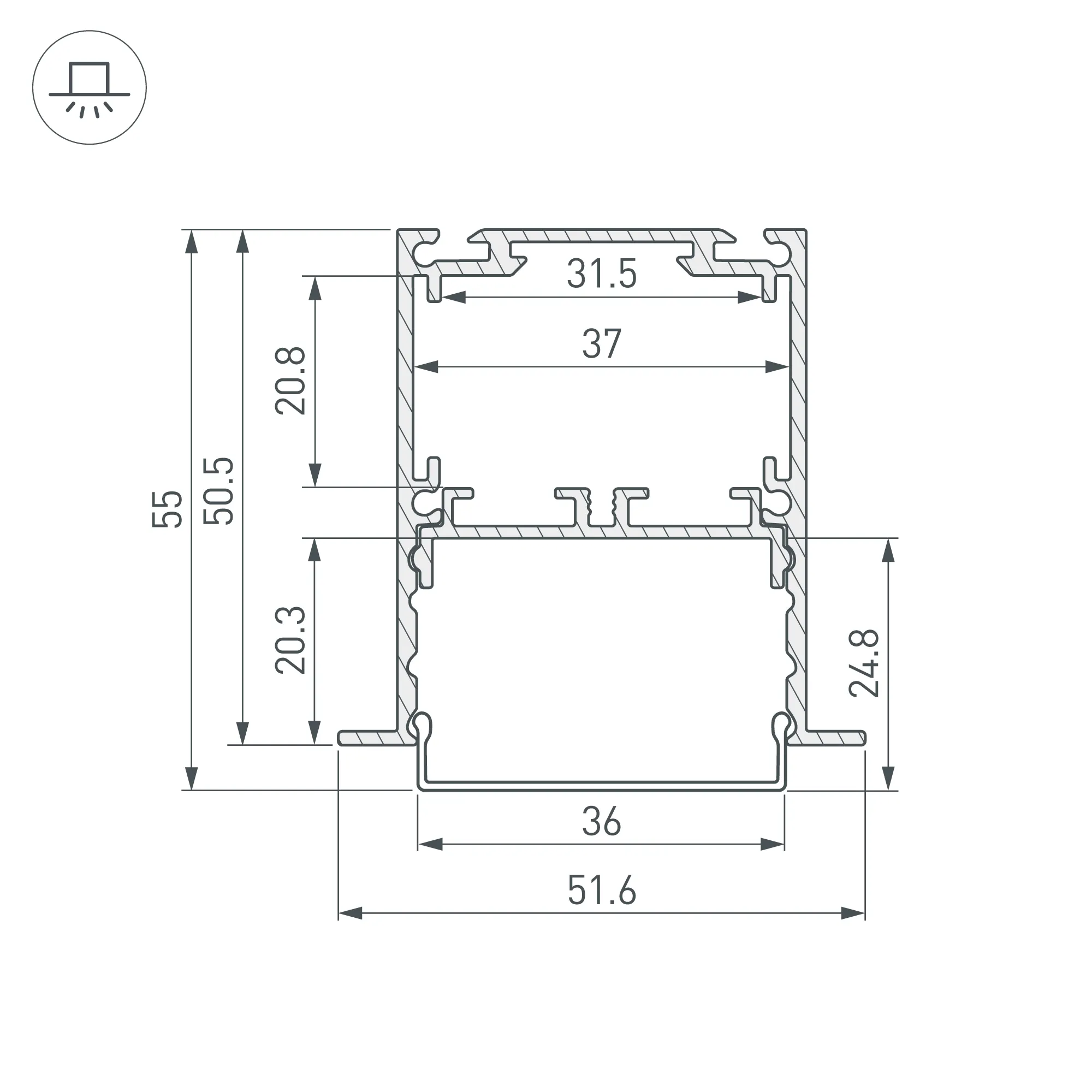 Встраиваемый алюминиевый анодированный профиль со съемной площадкой для светодиодной ленты в комплекте. Габаритные размеры (L×W×H): 2000x51,6x50,5 мм. Ширина площадки для ленты 33мм. Отсек для БП 31,5х20,8 мм. Возможность установки экрана на разных уровнях (три варианта). Экраны, заглушки и другие аксессуары приобретаются отдельно. Цена за 1 метр.