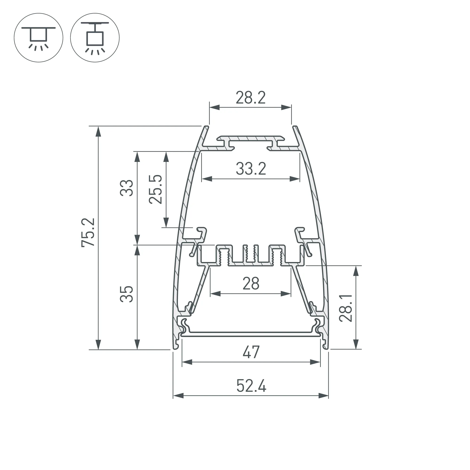 Алюминиевый накладной профиль для светодиодных лент и линеек. Цвет - черный RAL9005 (порошковая окраска). Габаритные размеры (L×W×H): 2000x75,2x52,4 мм. Ширина площадки для ленты 16 мм. Отсек для БП 33,2х25,5м. Экраны, заглушки и другие аксессуары приобретаются отдельно. Цена за 1 метр.