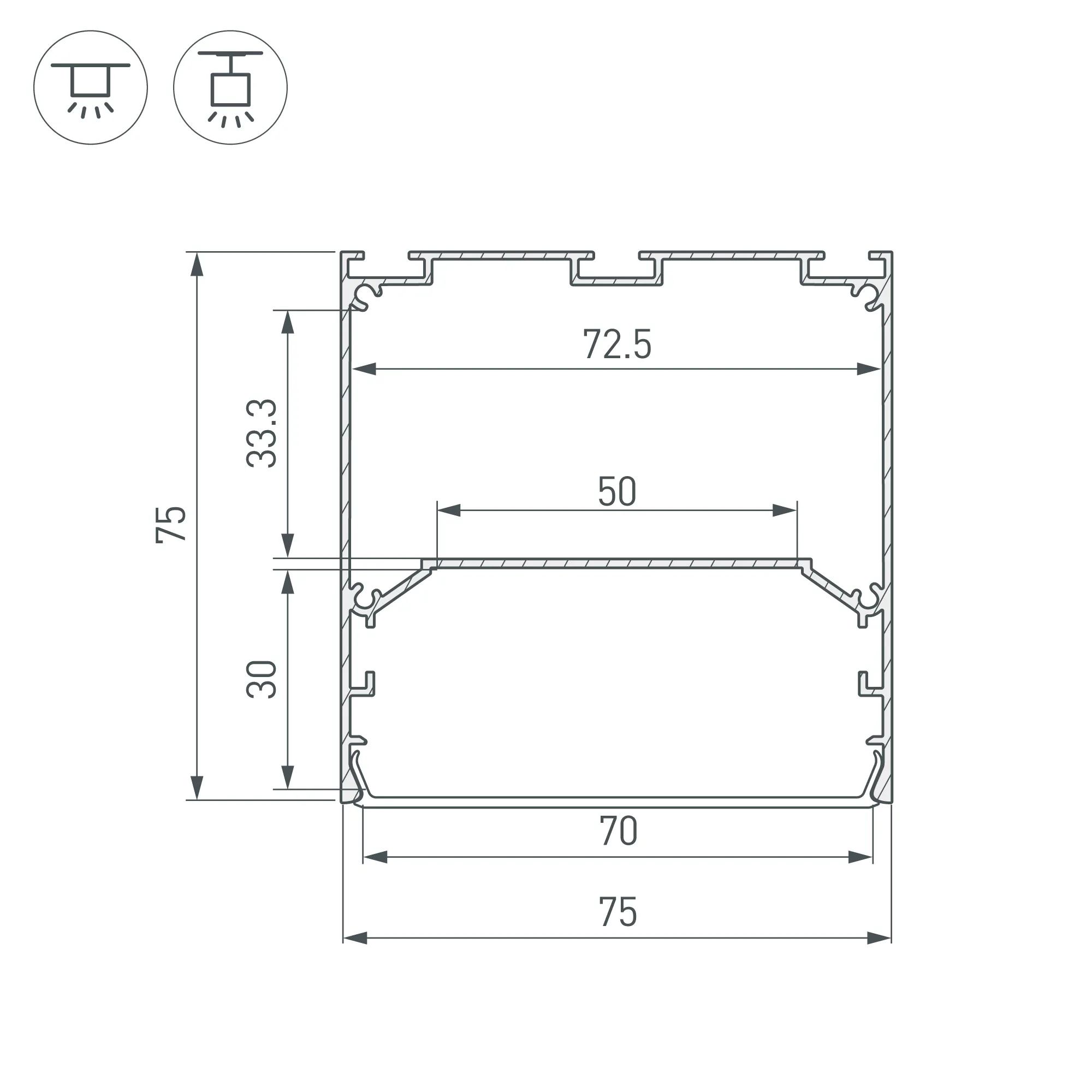 Алюминиевый анодированный профиль для светодиодных лент и линеек. Габаритные размеры (L×W×H): 3000x75x75 мм. Ширина площадки для ленты 50 мм. Отсек для БП 72,5х33,3 мм. Экраны, заглушки и другие аксессуары приобретаются отдельно. Цена за 1 метр.