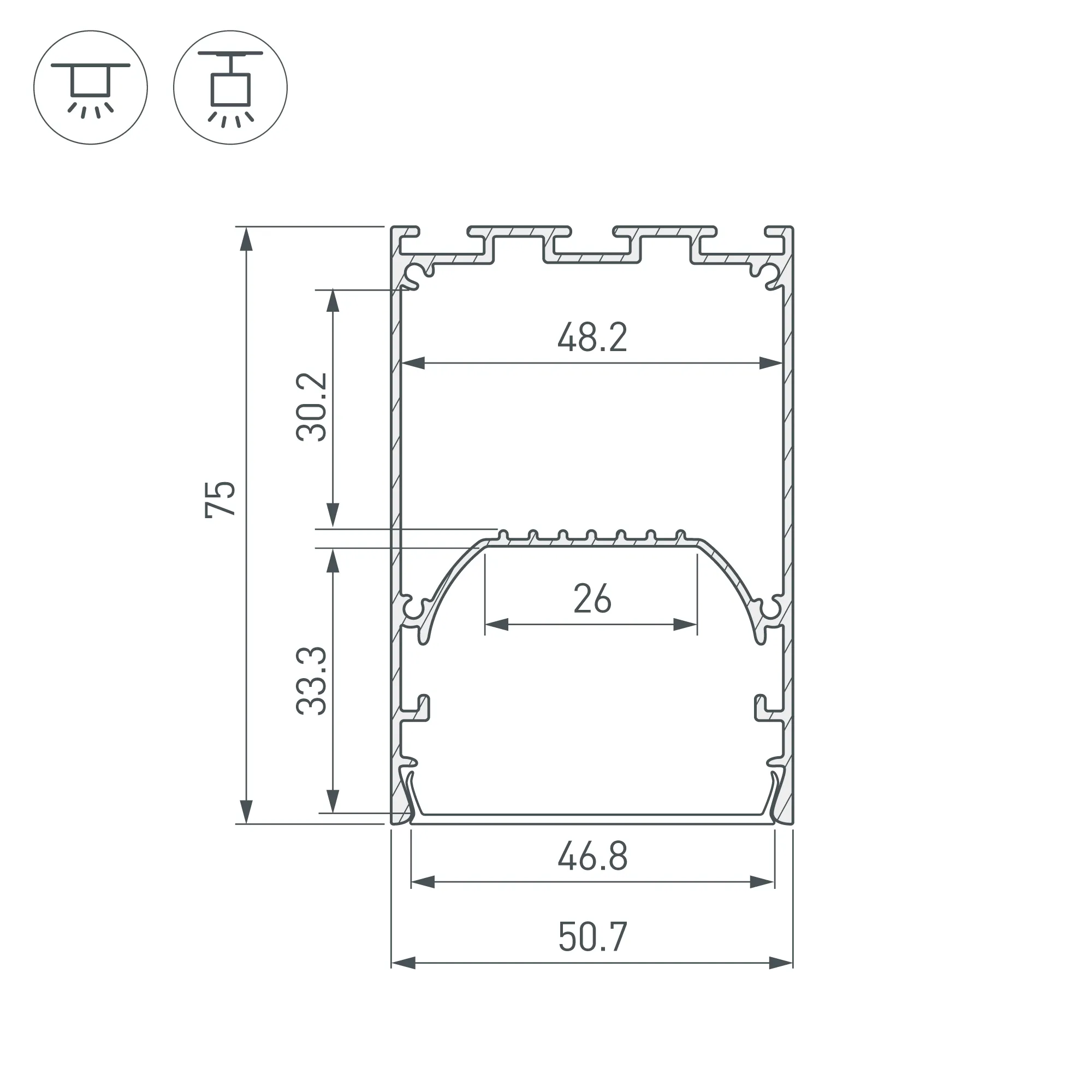 Алюминиевый профиль для светодиодных лент и линеек. Цвет - белый RAL9003 (порошковая окраска). Габаритные размеры (L×W×H): 2000x50,7x75 мм. Ширина площадки для ленты 26 мм. Отсек для БП 48,2х30,2 мм. Экраны, заглушки и другие аксессуары приобретаются отдельно. Цена за 1 метр.