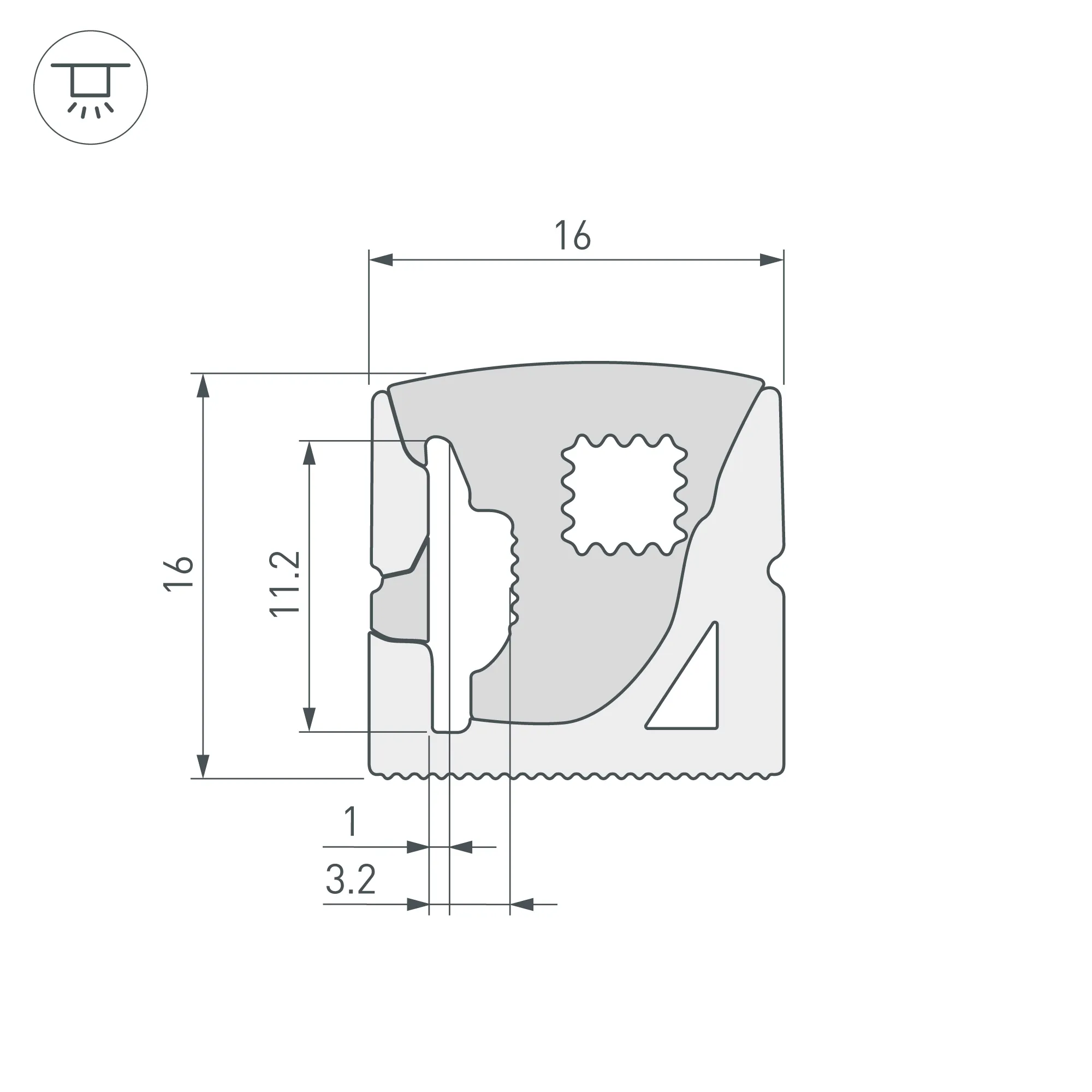 Цельнолитой силиконовый гибкий профиль, белый матовый. Габаритные размеры 20000×16×16 мм. Горизонтальный изгиб SIDE, минимальный радиус изгиба 30 мм. Для установки во влажных помещениях необходима герметизация при помощи двухкомпонентного эпоксидного герметика. Класс пылевлагозащиты – IP65 (при соблюдении технологии герметизации). Для лент шириной от 8 до11 мм, высотой до 3,3 мм и мощностью до 10 Вт/м. При подборе ленты необходимо учитывать, что втяжка лент COB, герметичных лент и лент с наличием силиконового слоя может быть затруднена. Угол излучения 110°. Поставляется в катушках по 20 м. Цена за 1 м.