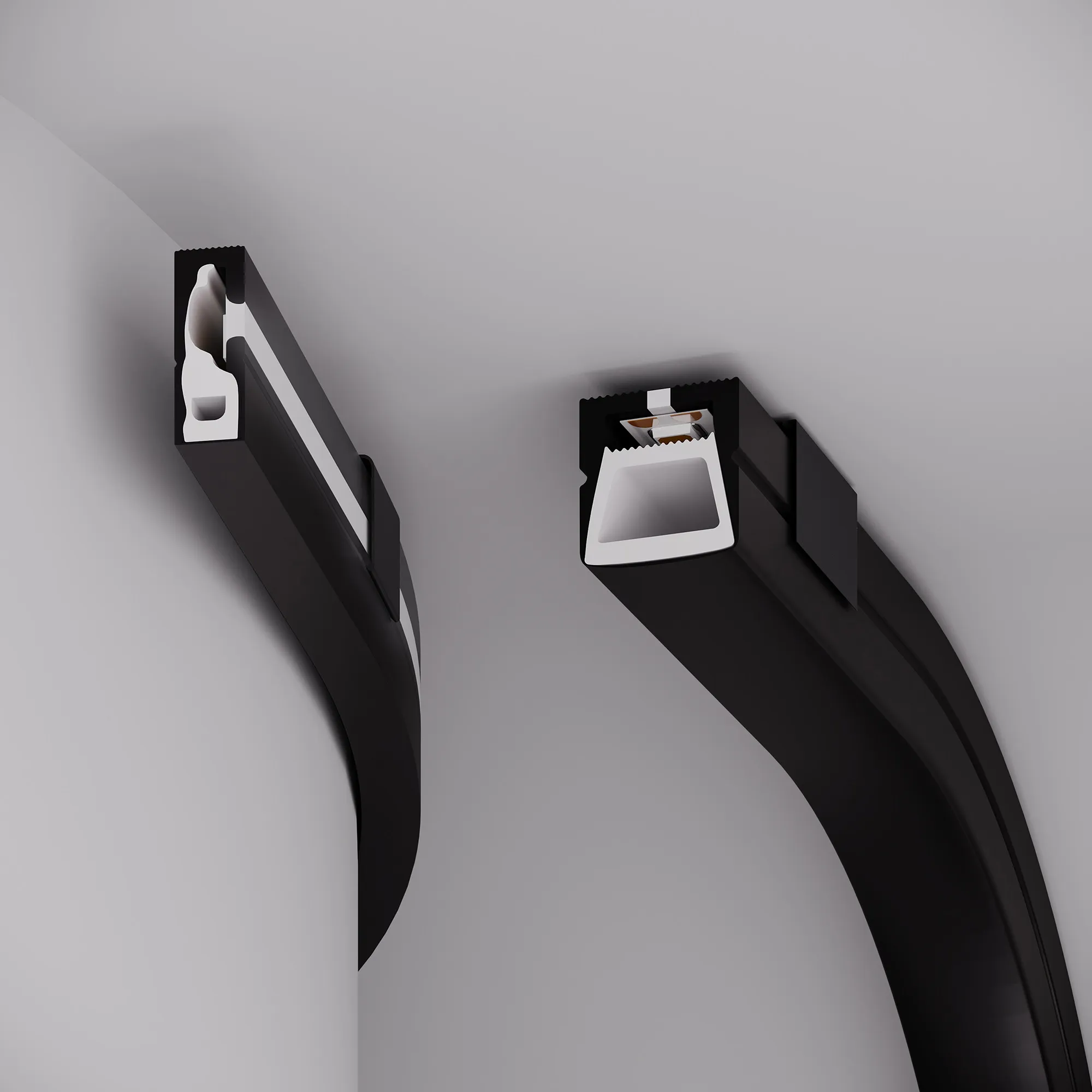 Цельнолитой силиконовый гибкий профиль, черный матовый. Габаритные размеры 5000×6×16 мм. Горизонтальный изгиб SIDE, минимальный радиус изгиба 30 мм. Для установки во влажных помещениях необходима герметизация при помощи двухкомпонентного эпоксидного герметика. Класс пылевлагозащиты – IP65 (при соблюдении технологии герметизации). Для лент шириной от 6 до 8 мм, высотой до 2,9 мм и мощностью до 10 Вт/м. При подборе ленты необходимо учитывать, что втяжка лент COB, герметичных лент и лент с наличием силиконового слоя может быть затруднена. Угол излучения 150°. Поставляется в катушках по 5 м. Цена за 1 м.