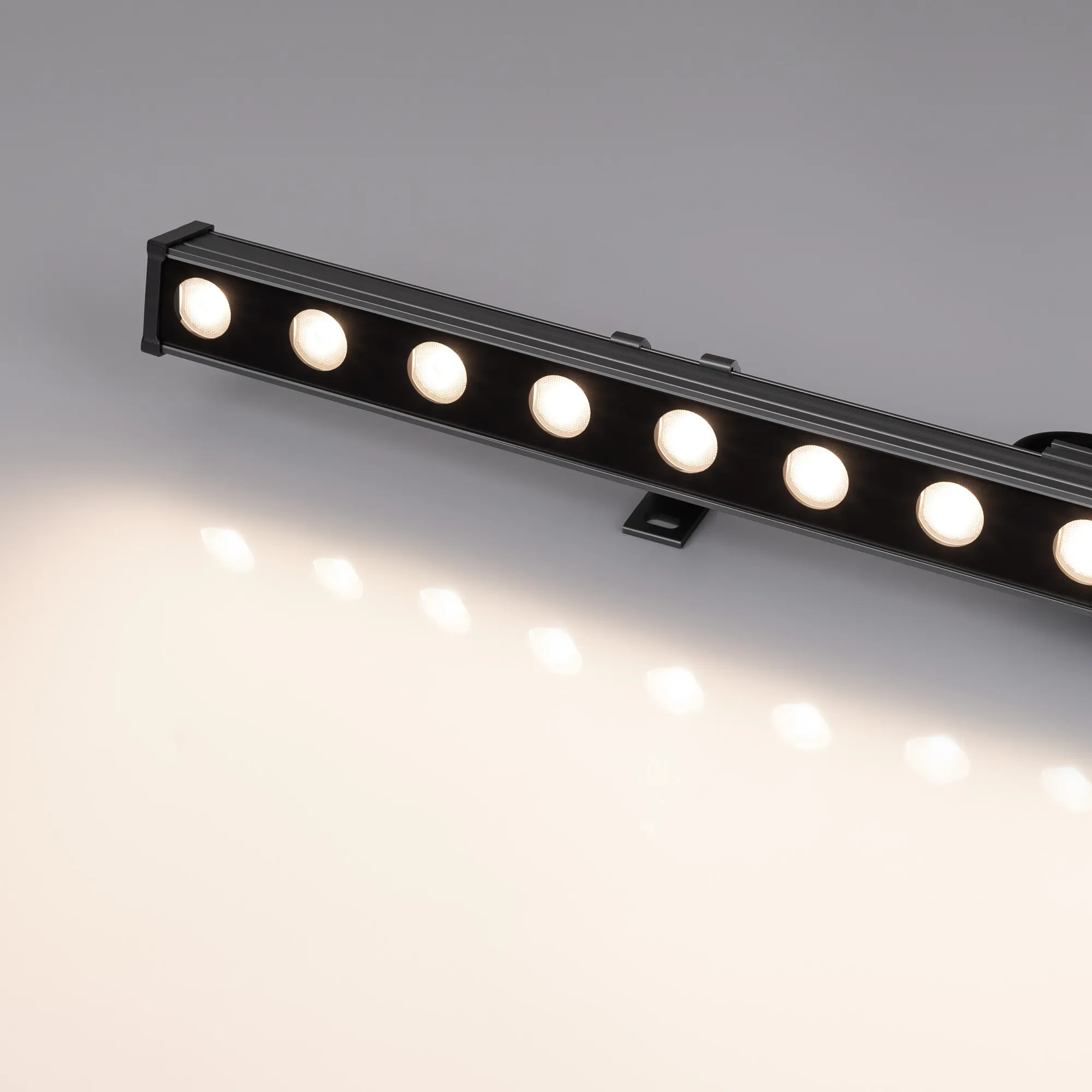 Линейный прожектор. Мощность 18 Вт, св. поток 1440 лм, 80 лм/Вт, дневной 4000 K, CRI>80, угол 30°, напряжение питания 230 В. Серый прямоугольный корпус из алюминия, экран стекло, степень защиты IP65. Размер: длина 760 мм, ширина 40 мм, высота 30 мм. Монтаж на кронштейнах.