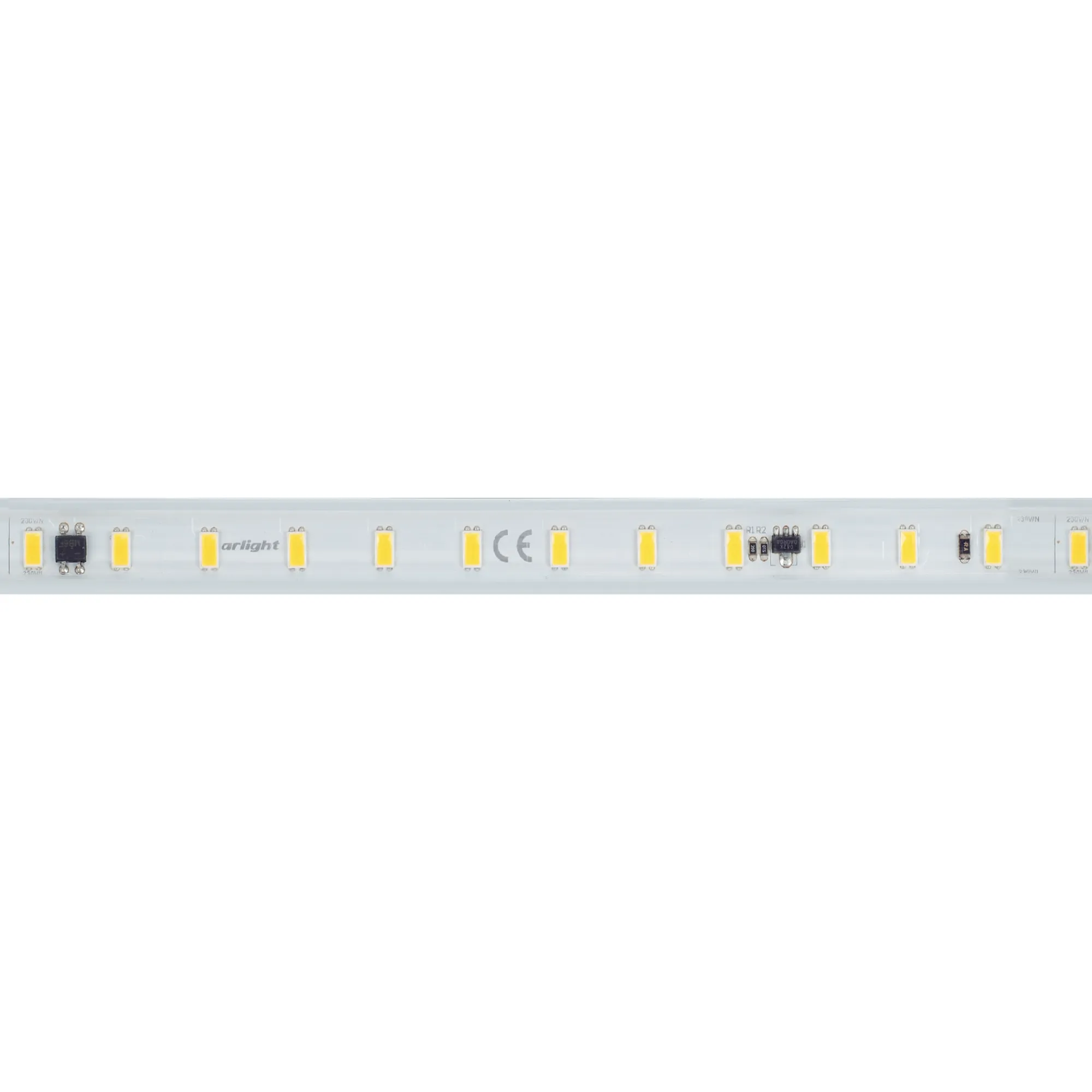 Поставка под заказ от 100 м. Светодиодная герметичная лента ARL серии C72, IP65 (PV - трубка, ПВХ экструзия. Светодиоды SMD 5630, 72 шт/м, белая плата шириной 12 мм. Цвет ТЕПЛЫЙ 2700K, индекс цветопередачи CRI>80, угол 120°. Питание 230 В, мощность 14 Вт/м (700 Вт на 50 м). Размеры 50000x15.5x6 мм. Мин. отрезок 166.67 мм, 12 светодиодов. Цена за 1 м. Светодиодная лента крепится с помощью скоб (приобретаются отдельно), 3M скотч отсутствует.