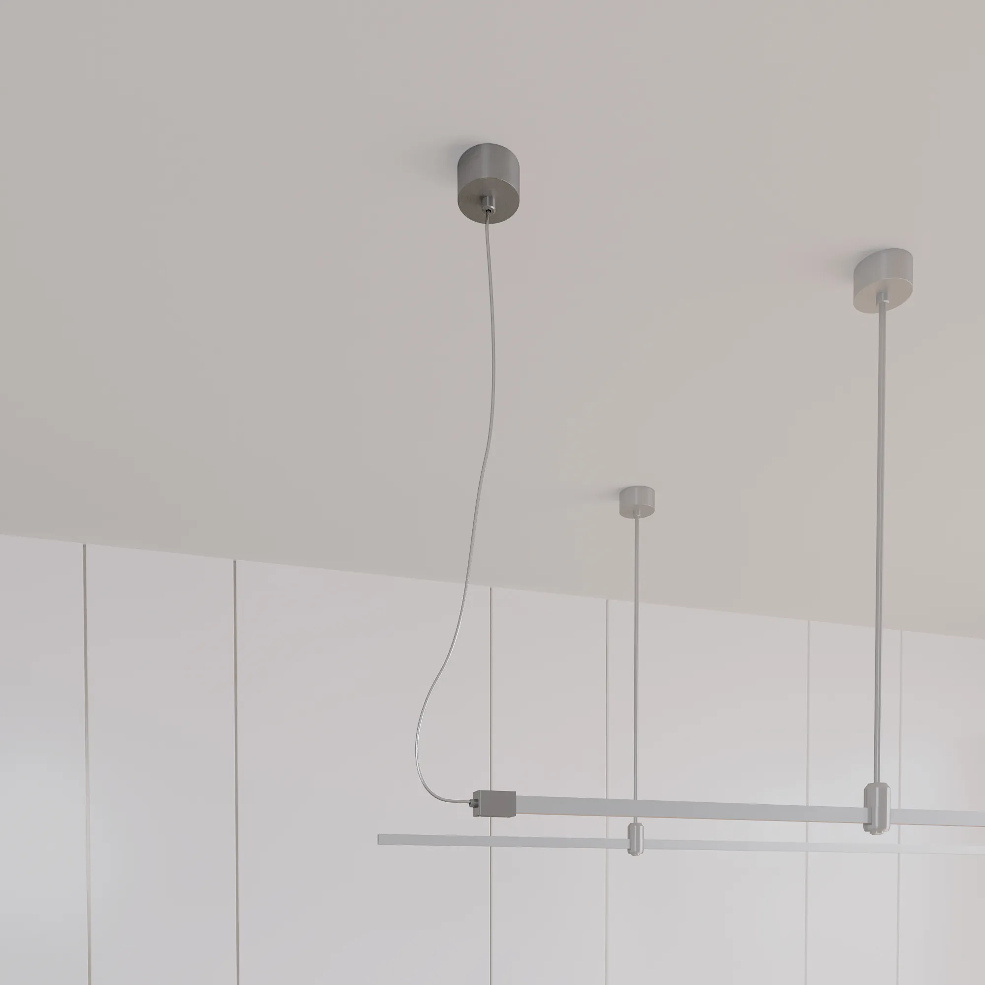 Потолочная чаша с боковым подводом питания треков системы APRIORI. Напряжение питания DC48V. Диаметр чаши 80 мм, внутренний диаметр чаши 74 мм, внешняя высота чаши 38 мм, глубина чаши до монтажного отверстия 25 мм, общая высота подвеса 5000 мм. Материал алюминий, цвет титан.