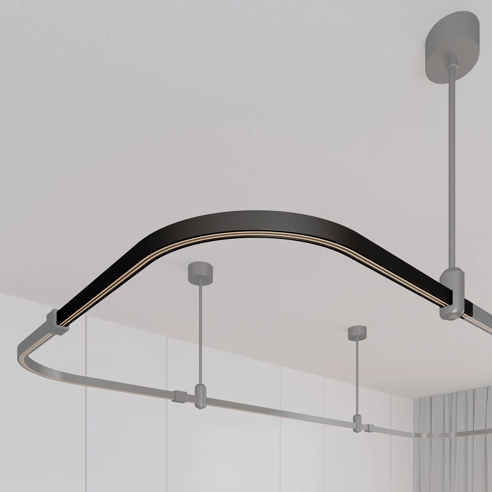 Подвесной угловой трек APRIORI, DC48V. Материал алюминий, цвет чёрный. Размер ДxШxВ: 500x500x22мм. Подвесы, коннекторы, светильники и источники питания приобретаются отдельно.