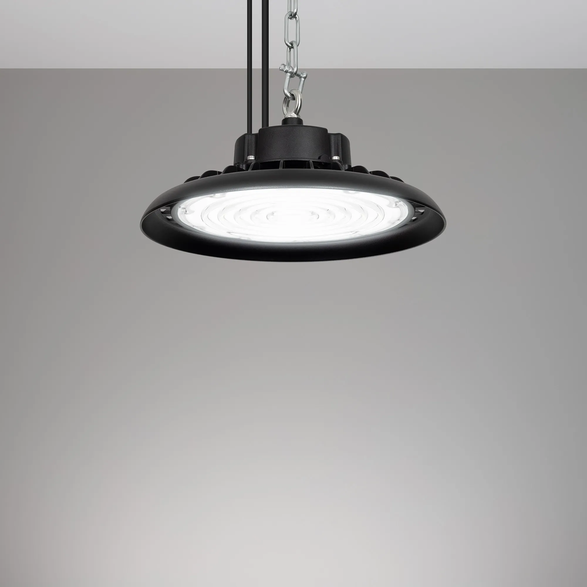 Светильник для освещения складских и промышленных помещений. Мощность 150W, напряжение питания AC 120-270V/50Hz. CRI 80. Тип светодиодов SMD2835, с групповой оптической линзой. Цвет свечения ДНЕВНОЙ 5000K, световой поток 22500 Lm, угол рассеивания 60°. Доступно управление по протоколу 0-10В. Цвет корпуса черный, линза из поликарбоната, степень влагозащиты IP65, ударопрочность IK08. Габариты Ф300xH140мм. Рым-болт в комплекте. Длина кабеля питания 900 мм, кабеля 0-10 200мм.