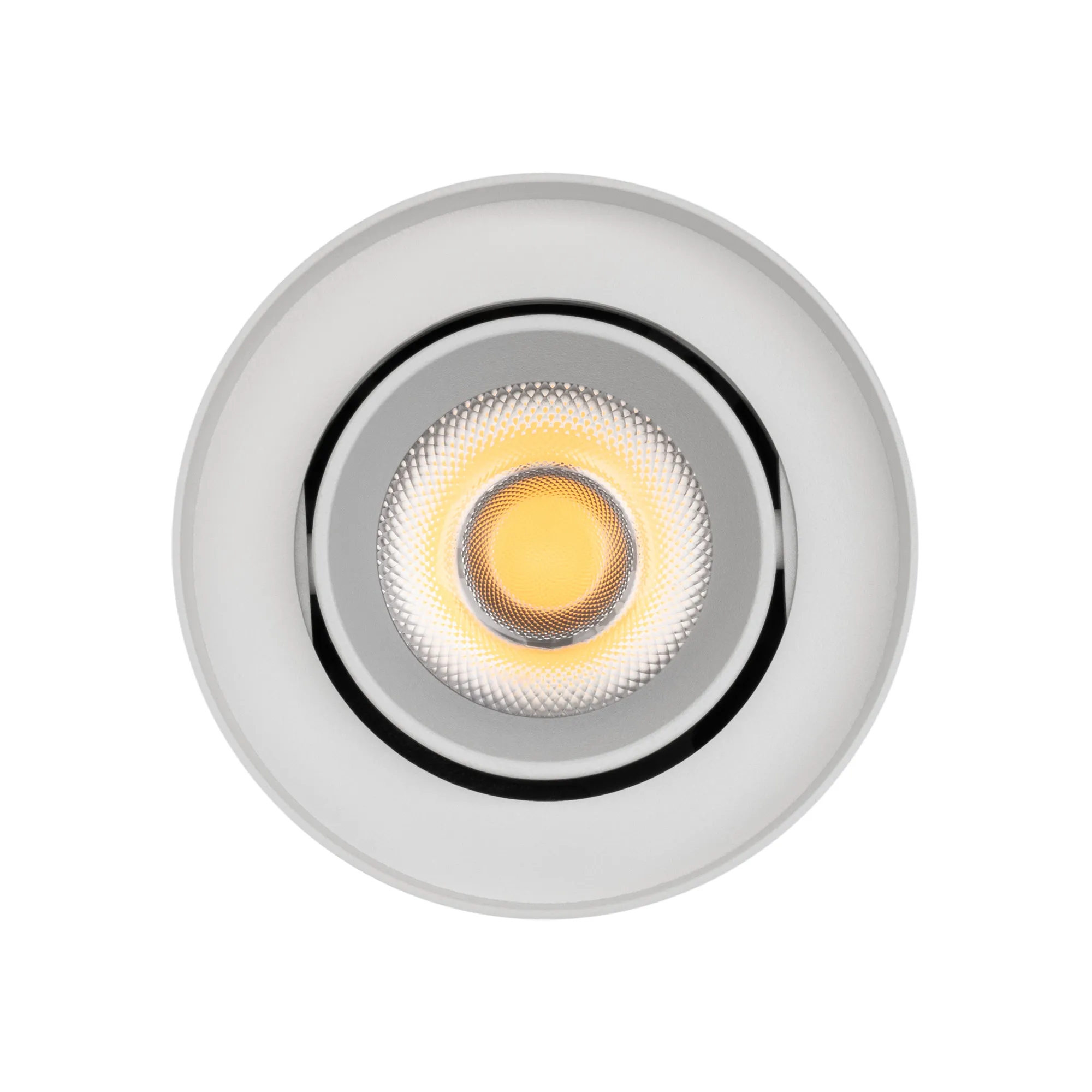 Накладной интерьерный светильник. Мощность 10 Вт, св. поток 970 лм, 93 лм/Вт, дневной 4000 K, CRI>90, угол 36°, регулируемое направление луча 40° (20+20), поворотный световой модуль вокруг своей оси на 340°, UGR <18, напряжение питания 230 В. Белый круглый корпус из алюминия, степень защиты IP54. Размер: диаметр 86,5 мм, высота 120 мм. Монтаж накладной. Драйвер 27-43 В, 250 мА, пульсация <1%.