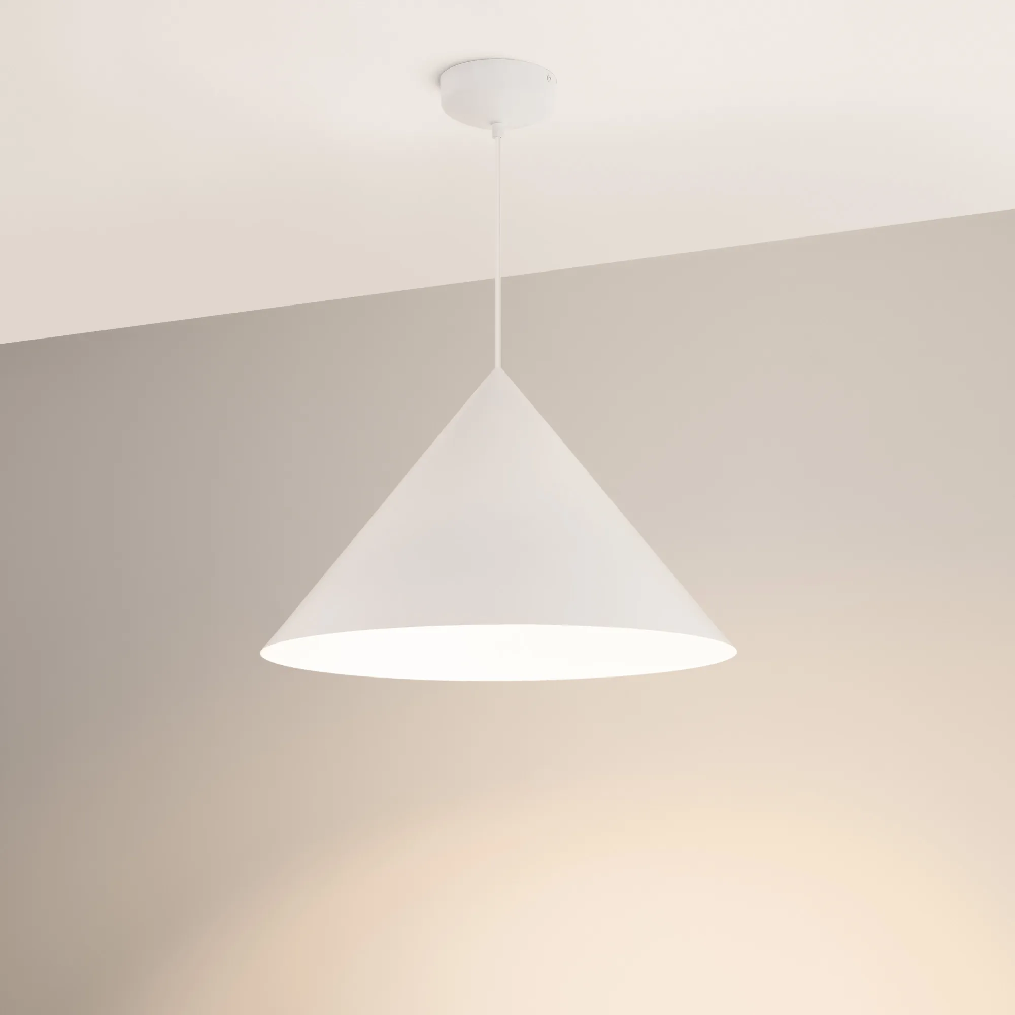 Подвесной светильник. Мощность 14 Вт, св. поток 1200 лм, 74 лм/Вт, тёплый 3000 K, CRI>92, угол 36°, напряжение питания 230 В. Белый корпус из алюминия в форме конуса с белой внутренней поверхностью, линза-рассеиватель из PMMA, степень защиты IP20. Размер: диаметр 550 мм, высота 340 мм. Монтаж подвесной, длина подвеса 2000 мм, регулируемая. В комплекте 2 вида чаш. Габариты встраиваемой чаши: Ø 80x23 мм. Габариты накладной чаши Ø140x55 мм. Драйвер 27-42 В, 350 мА, пульсация <1%. Управление по TRIAC.