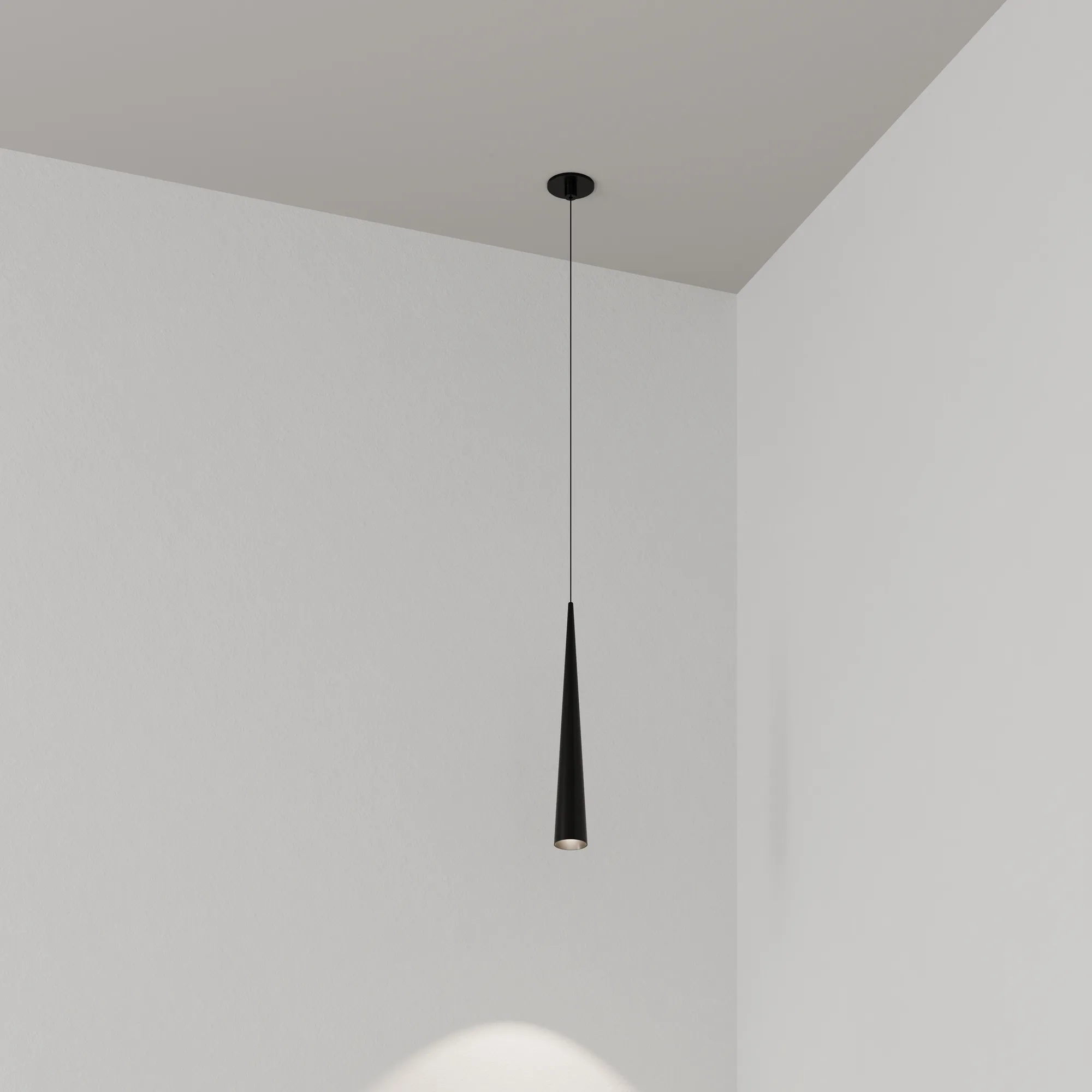 Подвесной светильник. Мощность 5 Вт, св. поток 400 лм, световая эффективность 70 лм/Вт, теплый 3000K, CRI>92, угол 36°, напряжение питания 230 В. Чёрный конусообразный вытянутый корпус из алюминия, линза из PMMA, степень защиты IP20. Размер: диаметр 57 мм, высота 400 мм. Монтаж подвесной, длина подвеса 2000 мм, регулируемая. В комплекте 2 вида чаш. Габариты встраиваемой чаши: Ø 80x41 мм. Габариты накладной чаши Ø80x60 мм. Драйвер 2,8-12В, 500 мА, пульсация <1%.