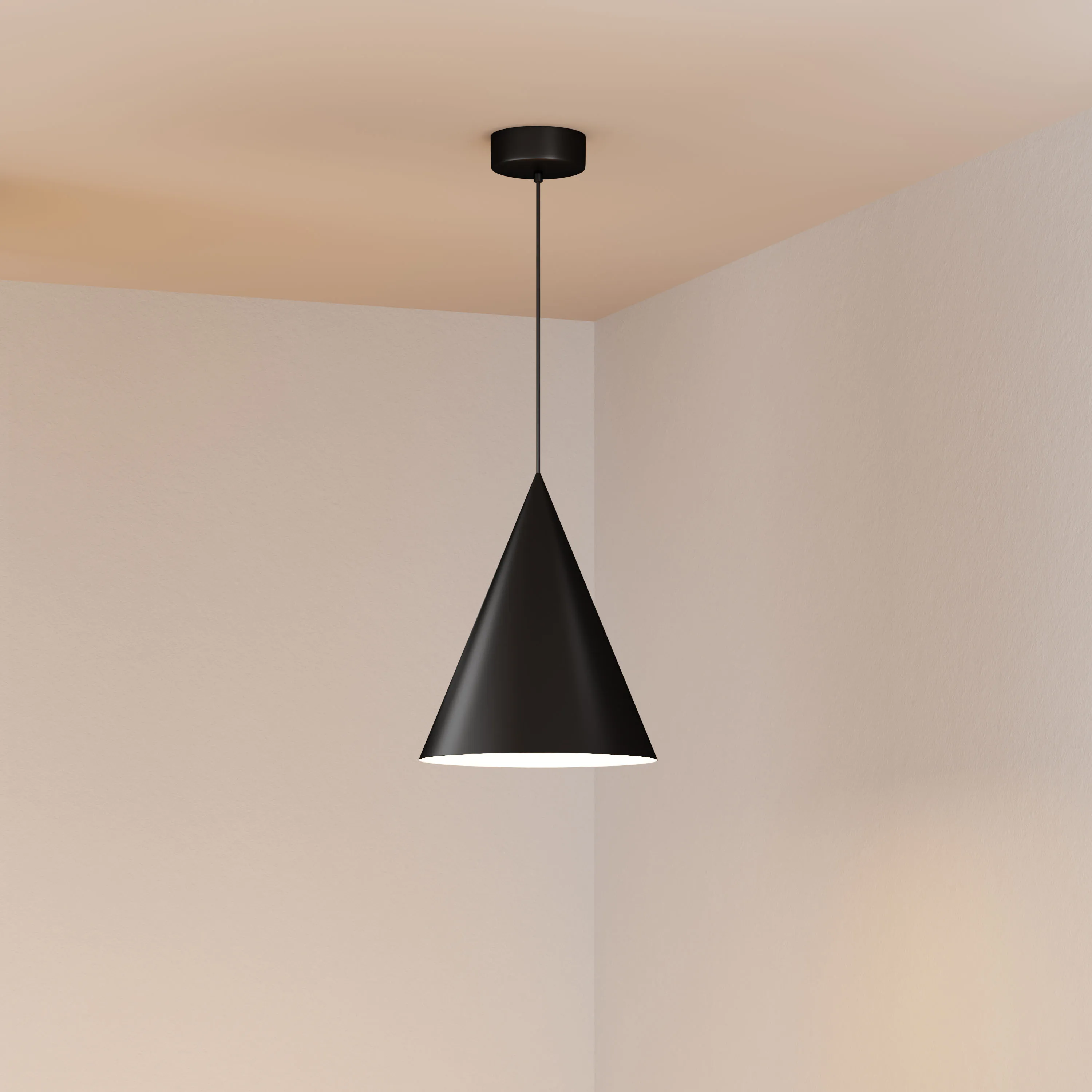 Подвесной светильник. Мощность 14 Вт, св. поток 1200 лм, 87 лм/Вт, теплый 3000 K, CRI>92, угол 36°, напряжение питания 230 В. Черный корпус из алюминия в форме конуса с белой внутренней поверхностью, линза-рассеиватель из PMMA, степень защиты IP20. Размер: диаметр 350 мм, высота 420 мм. Монтаж подвесной, длина подвеса 2000 мм, регулируемая. В комплекте 2 вида чаш. Габариты встраиваемой чаши: Ø 80x23 мм. Габариты накладной чаши Ø140x55 мм. Драйвер 27-42 В, 350 мА, пульсация <1%. Управление по TRIAC.
