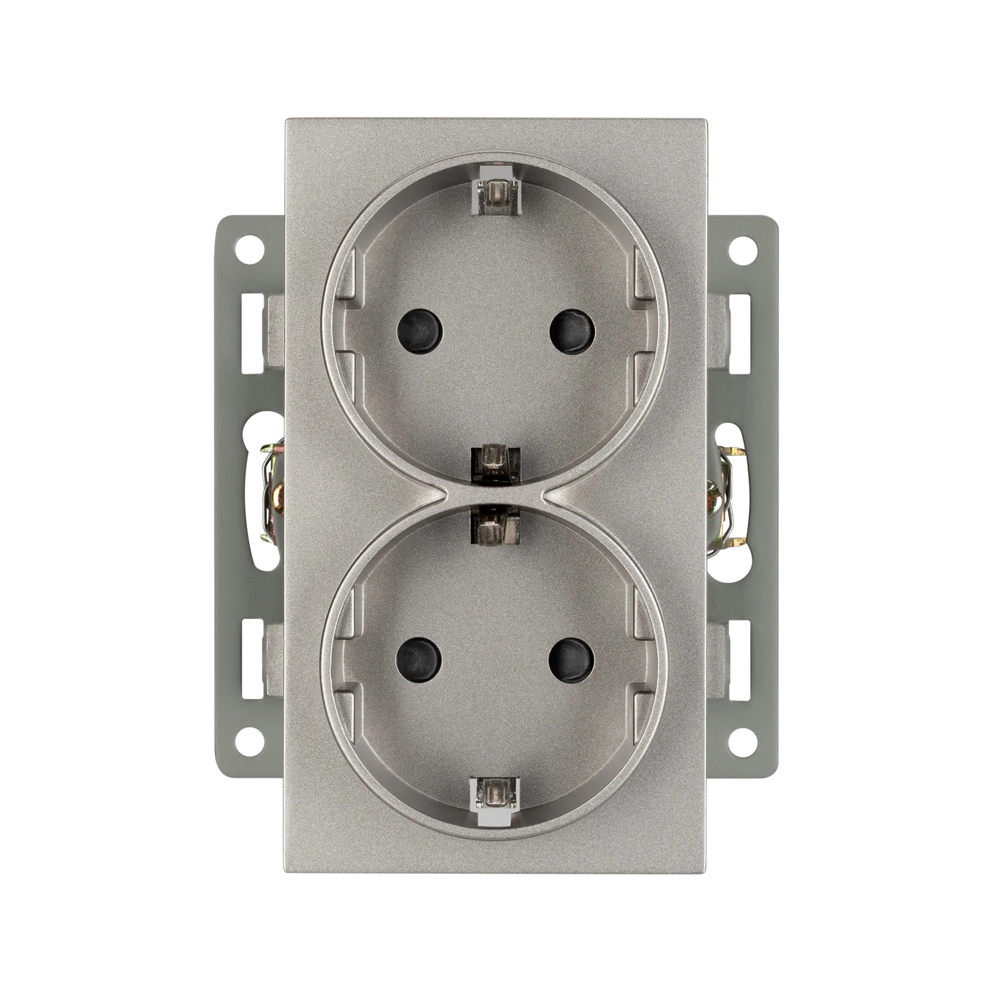 Механизм розетки вертикальный, с заземлением на 2 поста и с суппортом из алюминия. Цвет - серый. Степень пылевлагозащиты - IP20.