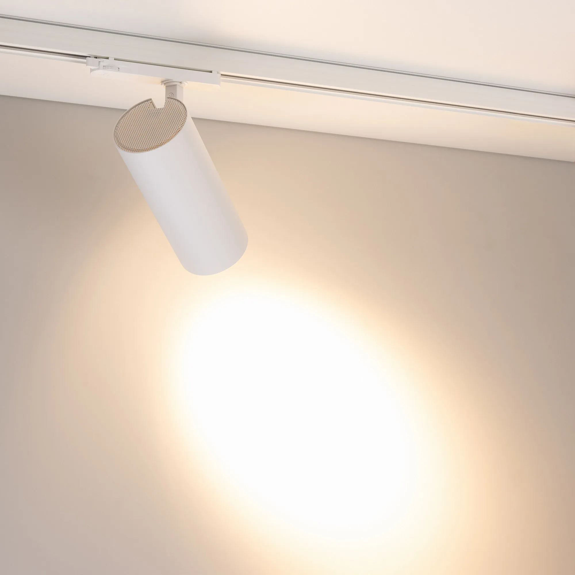 Светильник для треков/шин 4 провода. Мощность 40Вт, св. поток без решетки honeycomb 4000 лм, 100 лм/Вт, с решеткой honeycomb 2640 лм, 66 лм/Вт, теплый 3000 K, CRI>90, угол 24°, напряжение питания 230 В. Белый круглый корпус из алюминия, материал линзы PMMA, степень защиты IP20. Размер: диаметр 90 мм, длина световой части 141 мм. Монтаж на трек 3-фазный. Драйвер встроенный 24-42 В, 750мА., пульсация <5%