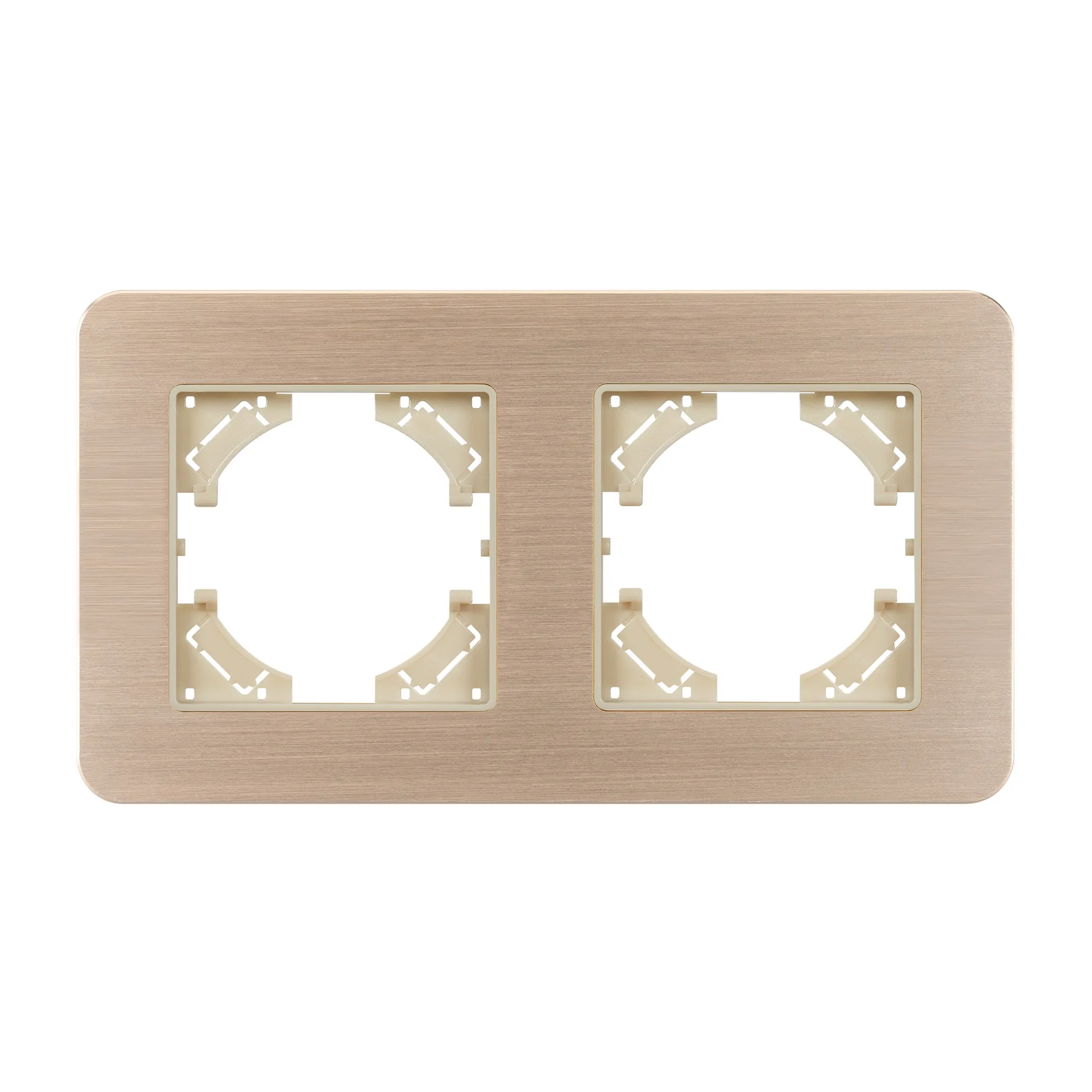Рамка алюминиевая на 2 поста, под встраиваемый механизм. Цвет - золотой. Уровень герметичности IP20. Ориентация монтажа - горизонтальная (основным ориентиром служат посадочные выступы для накладки механизма).