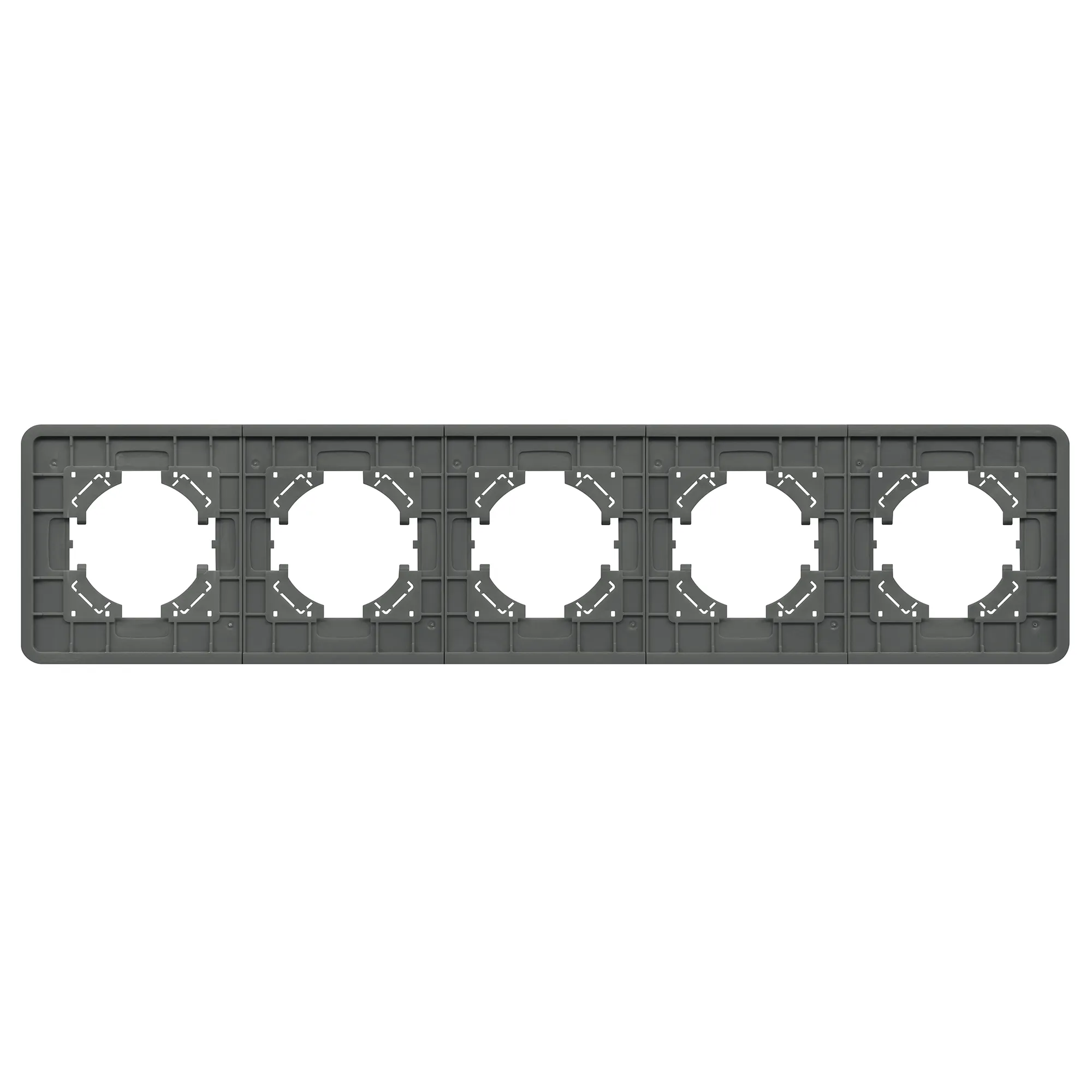 Рамка стеклянная на 5 постов, под встраиваемый механизм. Цвет - серый с Soft-Touch покрытием. Уровень герметичности IP20. Ориентация монтажа - горизонтальная (основным ориентиром служат посадочные выступы для накладки механизма).