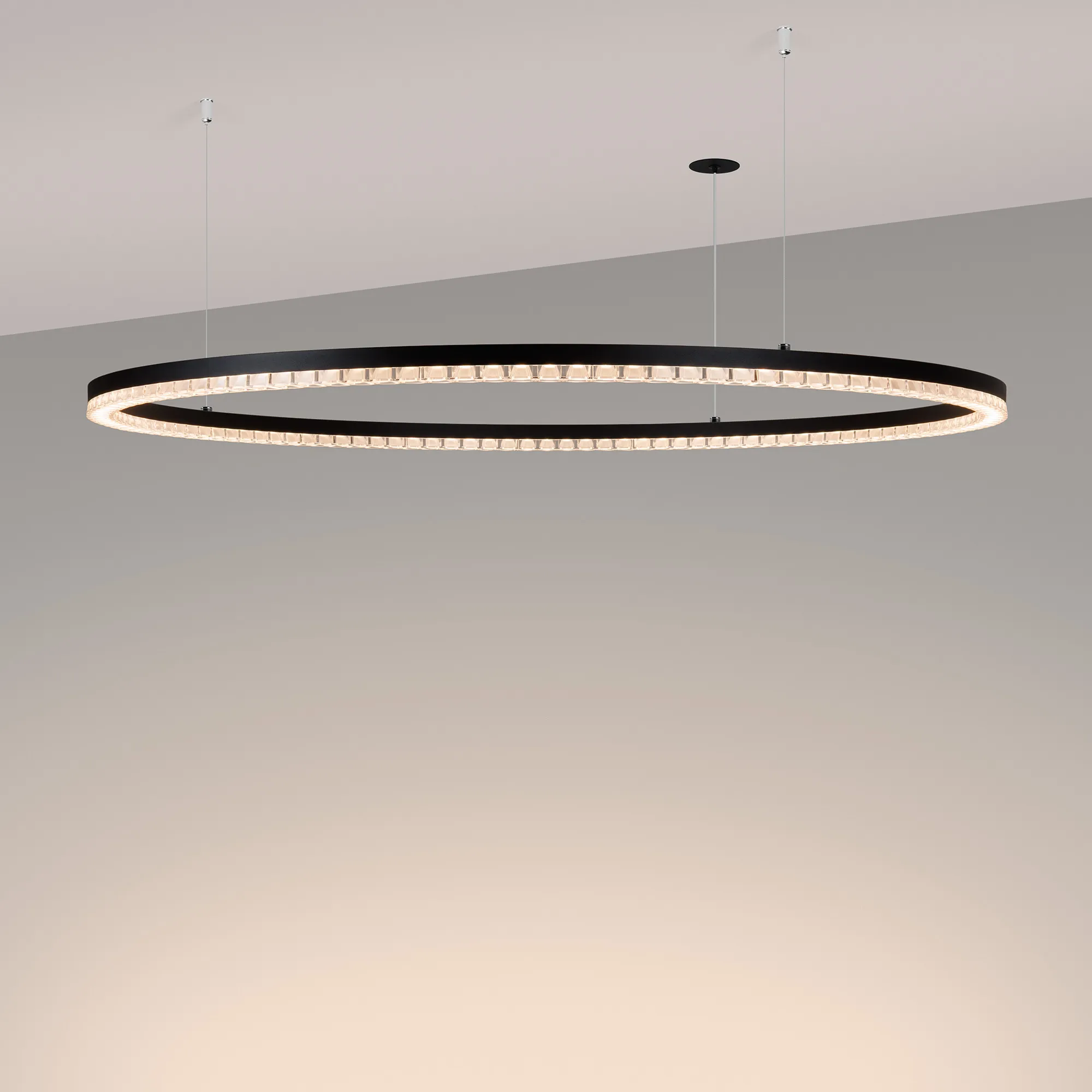 Подвесной светильник. Мощность 80 Вт, св. поток 6370 лм, 80-95лм/Вт, теплый 3000 K, CRI>90, угол 45°, напряжение питания 230 В. Черный круглый корпус из алюминия, экран PMMA, степень защиты IP20. Размер: диаметр 1250 мм, высота 34 мм, ширина профиля 30 мм, размер чаши: диаметр 65 мм, высота 26 мм. Монтаж подвесной, длина подвеса 1200 мм, тип чаши встраиваемый, диаметр установочного отверстия чаши 60 мм. Драйвер (2 шт) 9-38 В, 1050 мА. Пульсация <0,3 %.