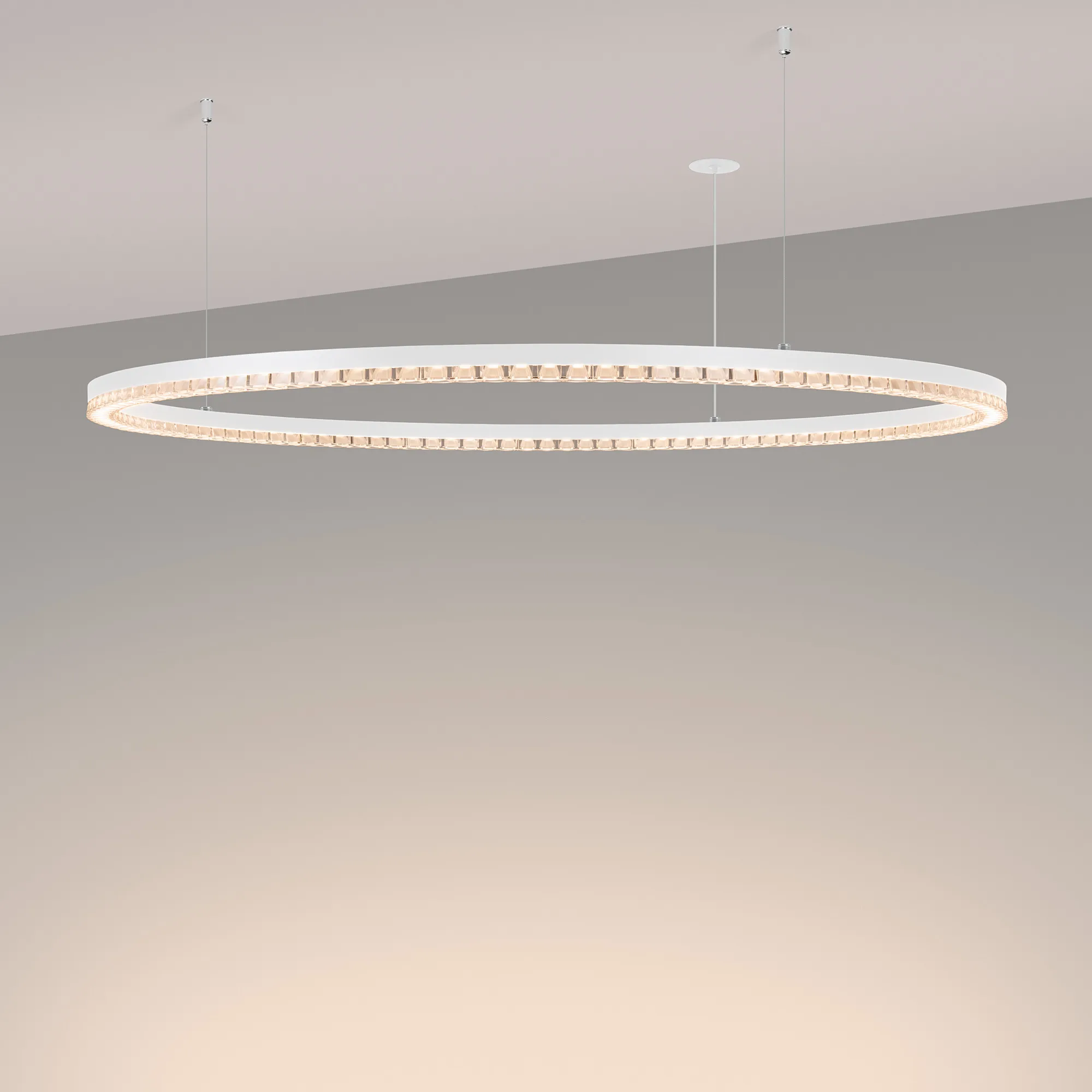 Под заказ. Подвесной светильник. Мощность 80 Вт, св. поток 6370 лм, 80-95 лм/Вт, теплый 3000 K, CRI>90, угол 45°, напряжение питания 230 В. Белый круглый корпус из алюминия, экран PMMA, степень защиты IP20. Размер: диаметр 1250 мм, высота 34 мм, ширина профиля 30 мм, размер чаши: диаметр 65 мм, высота 26 мм. Монтаж подвесной, длина подвеса 1200 мм, тип чаши встраиваемый, диаметр установочного отверстия чаши 60 мм. Драйвер (2 шт.) 9-38 В, 1050 мА. Пульсация <0,3 %.