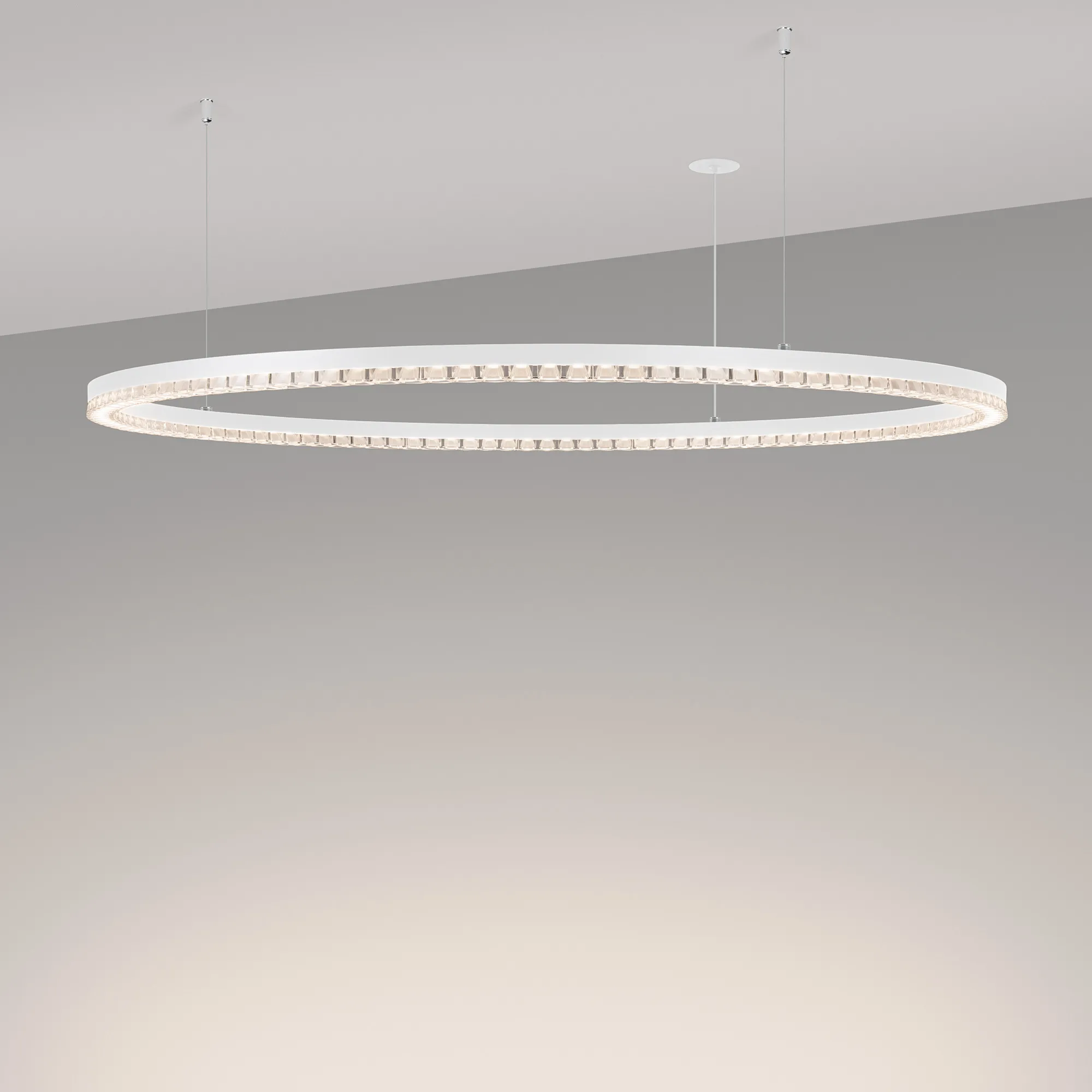 Под заказ. Подвесной светильник. Мощность 80 Вт, св. поток 7010 лм, 80-95 лм/Вт, дневной белый 4000 K, CRI>90, угол 45°, напряжение питания 230 В. Белый круглый корпус из алюминия, экран PMMA, степень защиты IP20. Размер: диаметр 1250 мм, высота 34мм, ширина профиля 30 мм, размер чаши: диаметр 65 мм, высота 26 мм. Монтаж подвесной, длина подвеса 1200 мм, тип чаши встраиваемый, диаметр установочного отверстия чаши 60 мм. Драйвер (2 шт.) 9-38 В, 1050 мА. Пульсация <0,3 %.