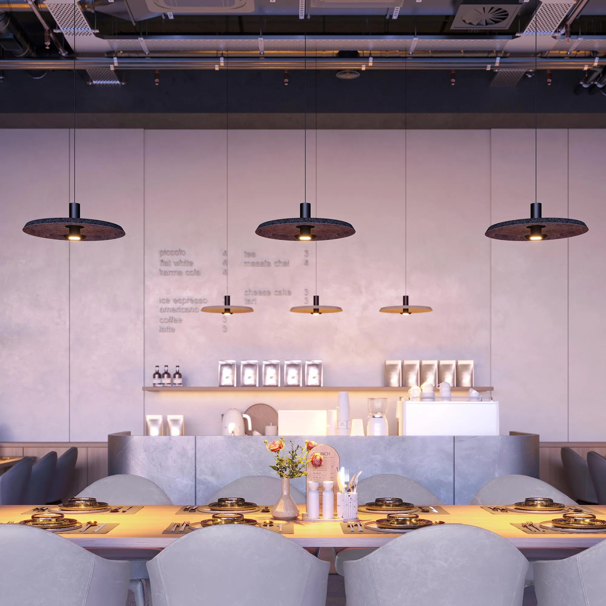 Подвесной светильник. Мощность 12 Вт, св. поток 708 лм, 59 лм/Вт, теплый 3000 K, CRI>94, угол 36°, напряжение питания 230 В. Темно-серый фигурный корпус из переработанного фетра с светло-серой внутренней поверхностью, линза-рассеиватель из PMMA, степень защиты IP20. Размер: диаметр 350 мм, высота 145 мм. Монтаж подвесной, длина подвеса 2000 мм, регулируемая. В комплекте 2 вида чаш. Габариты чаши (встраиваемая) Ø80 х 23 мм, врезное отверстие Ø60 мм. Габариты чаши (накладная) Ø120 x 35 мм. Драйвер 59 В, 300 мА, пульсация <1%. Управление по TRIAC.