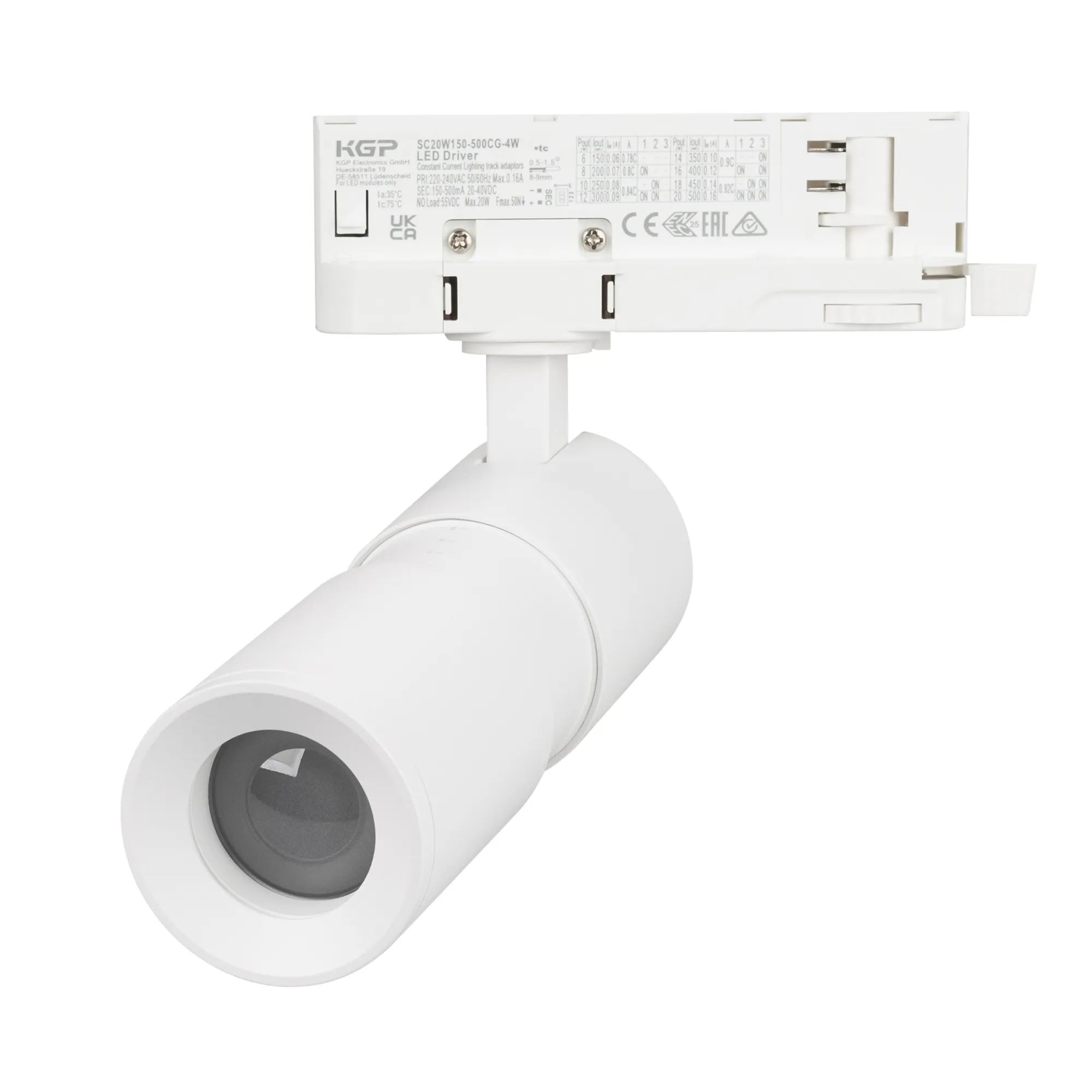 Светильник для треков/шин 4 провода с управлением DALI, Мощность 12Вт. Цвет свечения дневной 4000K, световой поток 721 лм, 65 лм/Вт, регулируемый угол 8-80°, CRI>90. Корпус круглый, алюминий, цвет белый, IP20. Размеры L × W × H (Ø) 192 х 144 х Ø55 мм. Входное напряжение AC220-240V. Монтаж на трек 3-фазный. Драйвер 10-42В (300-800 мА), 50/60Гц, максимальная мощность 42W