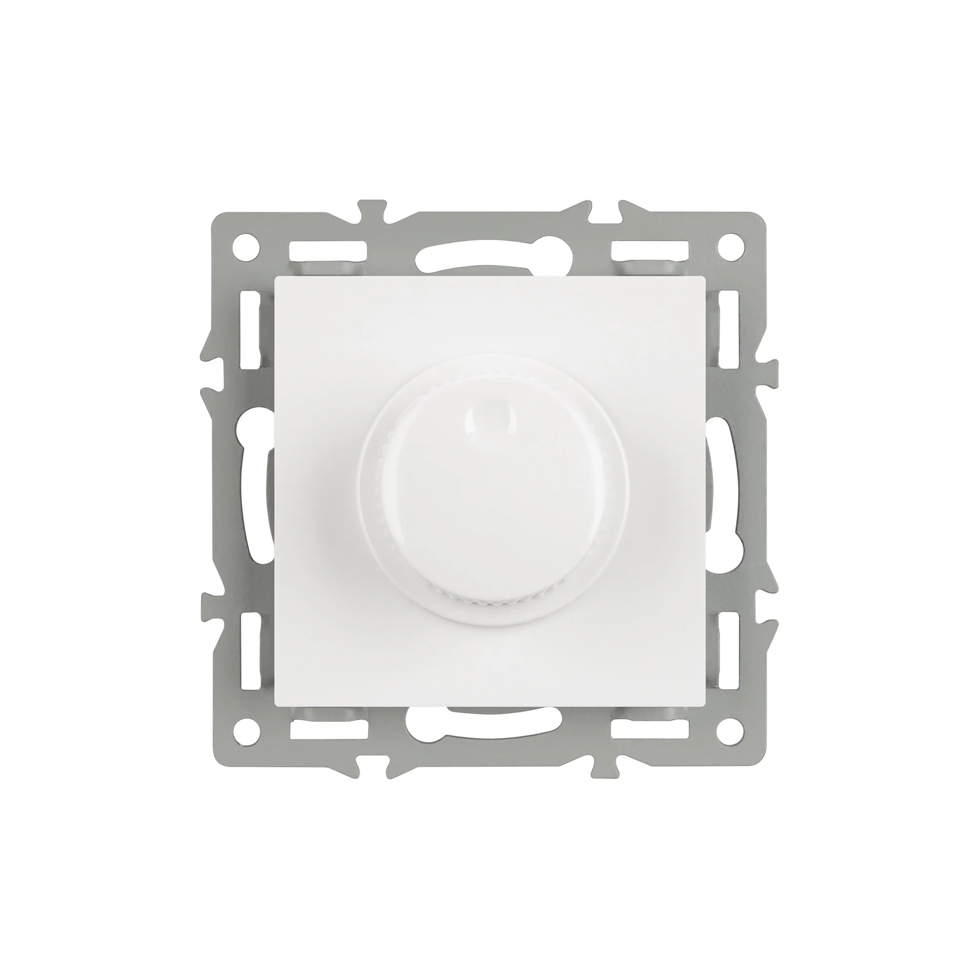 Механизм регулировки света на 1 пост, с суппортом из алюминия. Цвет - белый. Без фронтальной рамки. Уровень пылевлагозащиты - IP20. Механизм устанавливается в стандартный круглый подрозетник. Максимальная нагрузка 300 Вт только для ламп накаливания и галогенных, 100 Вт только для энергосберегающих и светодиодных ламп.