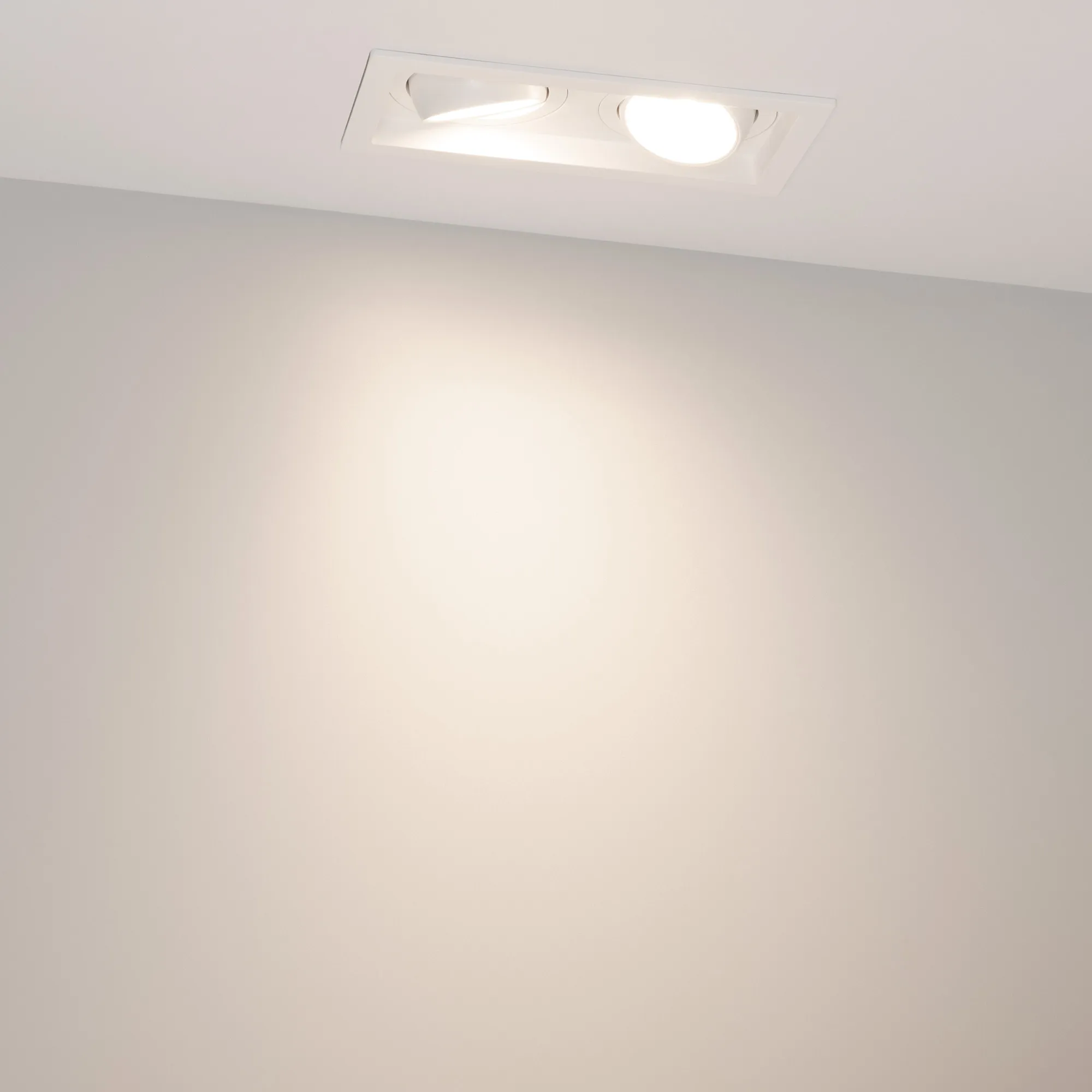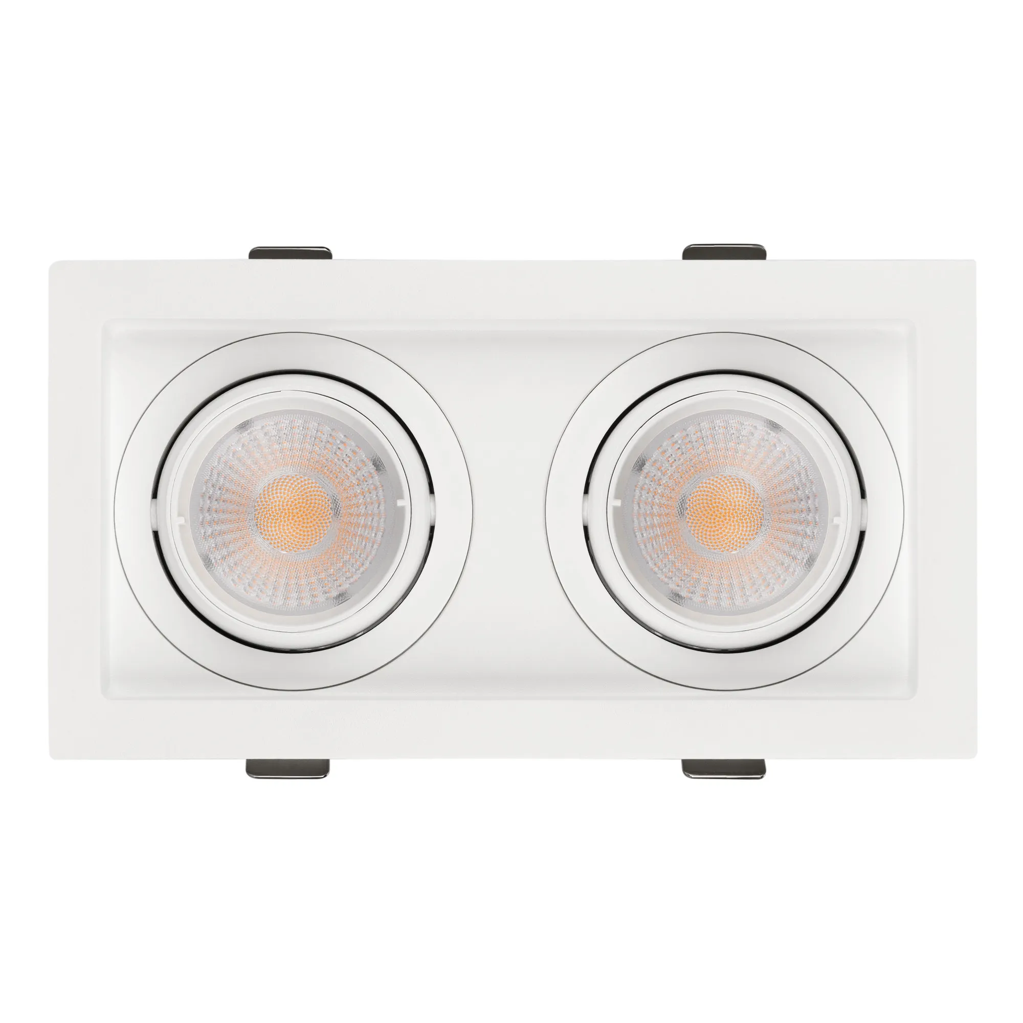 Встраиваемый карданный светильник. Мощность 2х12 Вт, св. поток 2788 лм, 116 лм/Вт, тёплый 4000 K, CRI>92, угол 40°, напряжение питания 230 В. Белый корпус из алюминия, белая вставка, степень защиты IP20. Размер: длина 170 мм, ширина 90 мм, высота 80 мм. Монтаж встраиваемый, установочное отверстие: длина 155 мм, ширина 75 мм. Драйвер 27-40 В, 300 мА, пульсация <2%.