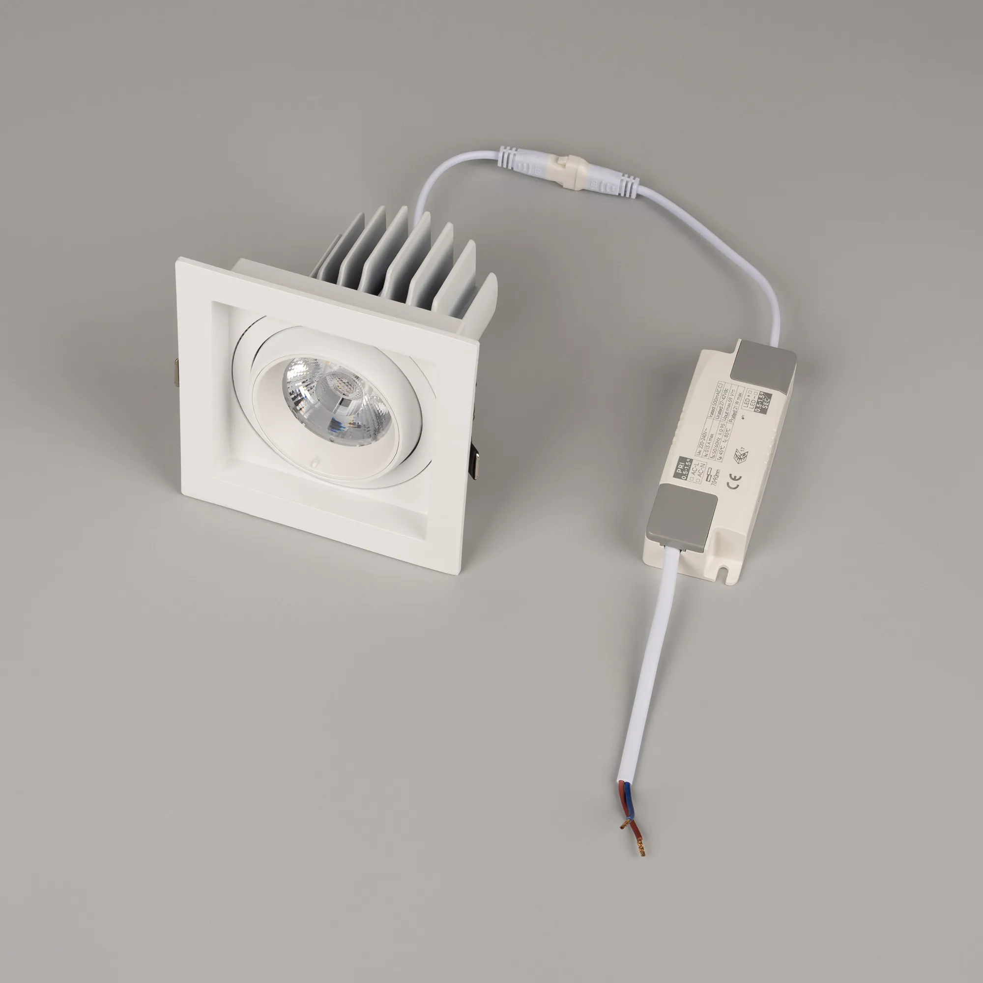 Встраиваемый карданный светильник. Мощность 20 Вт, св. поток 2067 лм, 103 лм/Вт, тёплый 3000 K, CRI>92, угол 20°, напряжение питания 230 В. Белый корпус из алюминия, белая вставка, степень защиты IP20. Размер: длина 117 мм, ширина 117 мм, высота 105 мм. Монтаж встраиваемый, установочное отверстие: длина 95 мм, ширина 95 мм. Драйвер 24-42 В, 500 мА, пульсация <2%.
