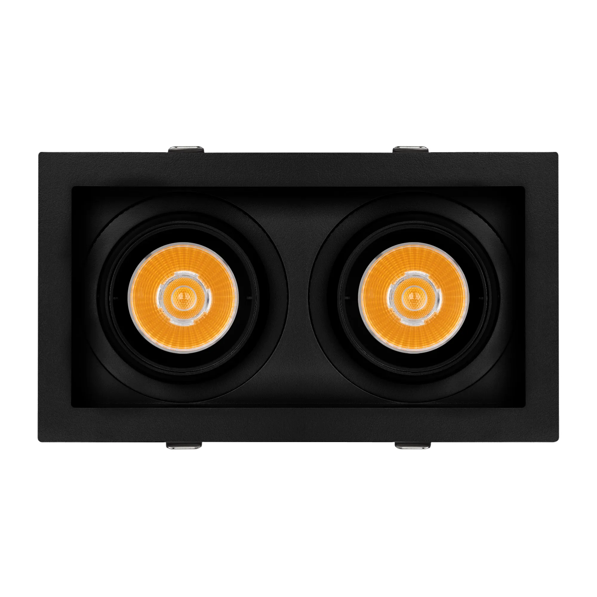 Поставка под заказ от 30 шт. Встраиваемый карданный светильник. Мощность 2х20 Вт, св. поток 4134 лм, 103 лм/Вт, дневной 4000 K, CRI>92, угол 20°, напряжение питания 230 В. Чёрный корпус из алюминия, белая вставка, степень защиты IP20. Размер: длина 210 мм, ширина 117 мм, высота 105 мм. Монтаж встраиваемый, установочное отверстие: длина 190 мм, ширина 95 мм. Драйвер 24-42 В, 500 мА, пульсация <2%.